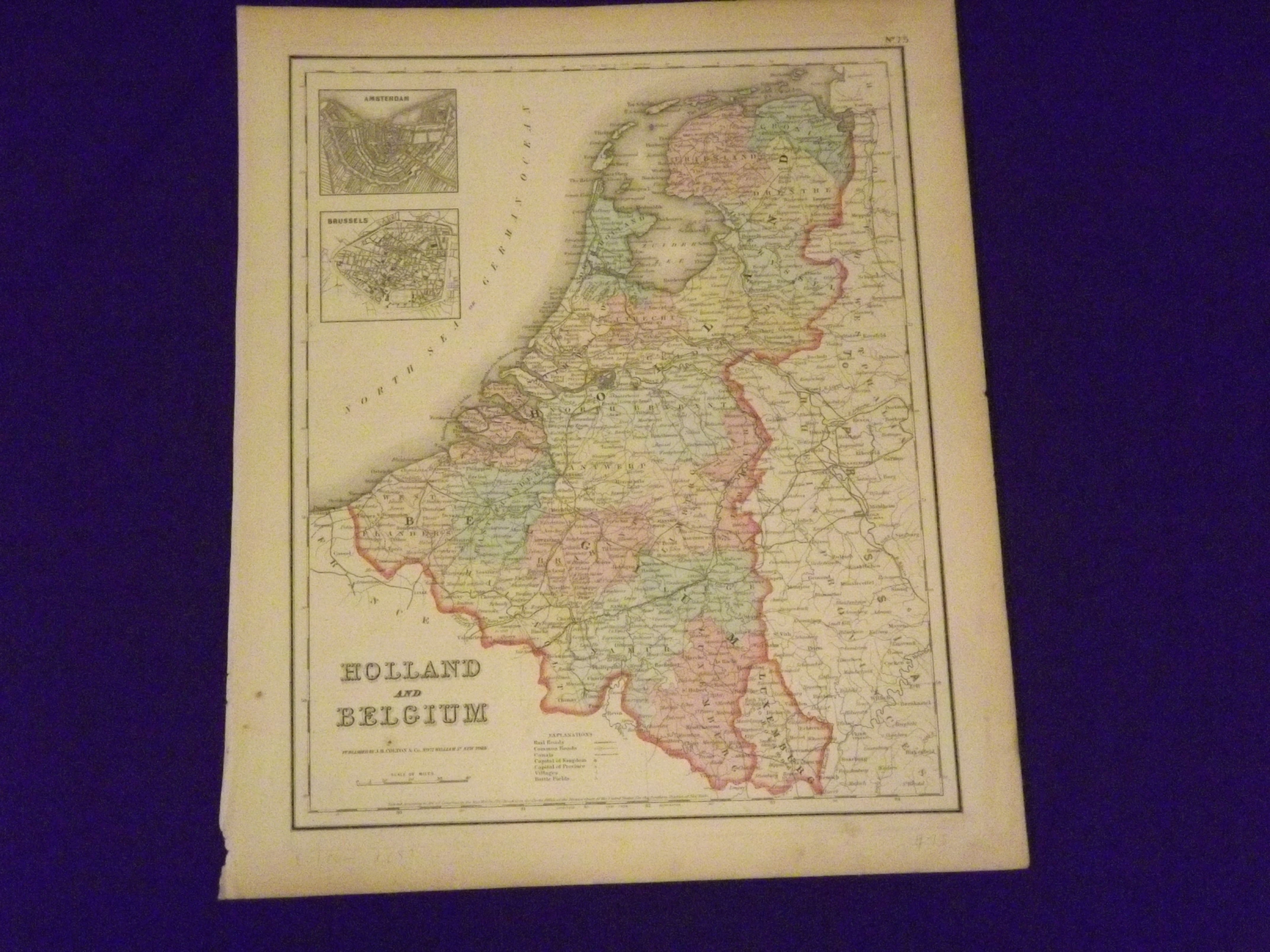 Unbound, colored engraved map, 16" x 13". Some browning and aging, and a little finger soiling and some creasing in margins, small margin tear in margin, repaired with archival tape; overall in very good condition. Maps are wrapped with acid free board, or in rigid sleeves. Beginning with J. H. Colton (1800-1893), the Colton family published atlases for over 30 years. Colton's Atlas of the World was first published in 1855 in a large two volume set. In 1857 it became Colton's General Atlas, and Colton's sons, George Woolworth and Charles B. would take over the business. This map of Holland and Belgium is from the 1857 edition of Colton's General Atlas, even though the copyright date on the map is 1855. The map is colorful with a fair amount of detail, and includes small inserts featuring Amsterdam and Brussels. Extra postage may be required. Ristow 313-326.