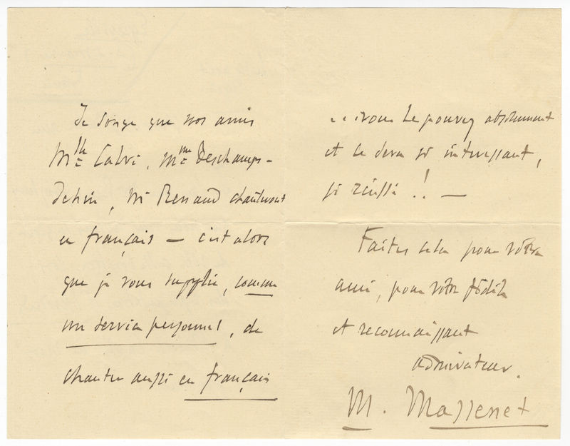 "It is my dream that our friends Mlle. Calvé, Mme. Deschamps-Jéhin, Mr. Renaud sing in French -- thus, I beg you, as a personal service, to sing in French as well ... You can absolutely do it, and it will be so interesting, so successful!"