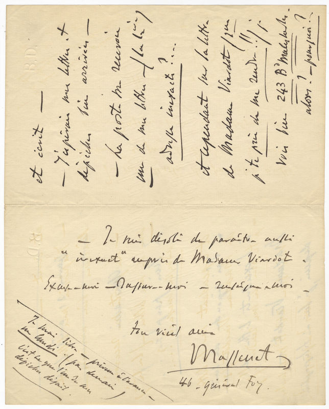 Massenet is worried that his messages have not reached Pauline Viardot: the post office has returned one of his letters. He does not want Viardot to think him unreliable, and asks his correspondent to reassure him.