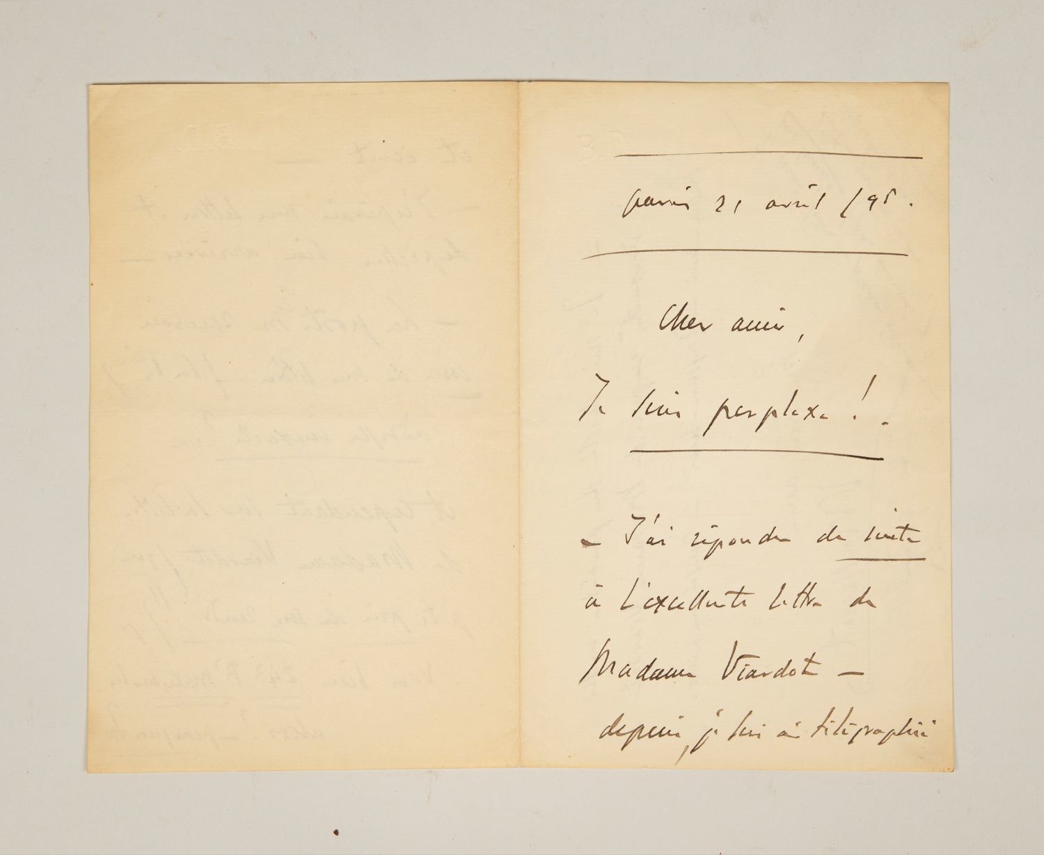 Octavo. 3 pp. of a bifolium. Dated Paris, April 21, [18]95, In French (with translation).