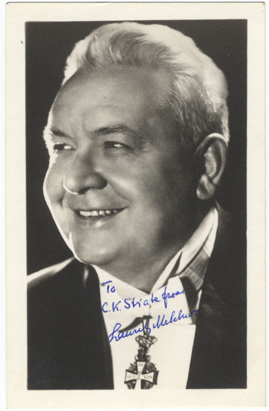 Bust-length photograph in formal attire as Commander of the Order of the Dannebrog. Signed in full and inscribed in blue: "To C. K. Strate from Lauritz Melchior