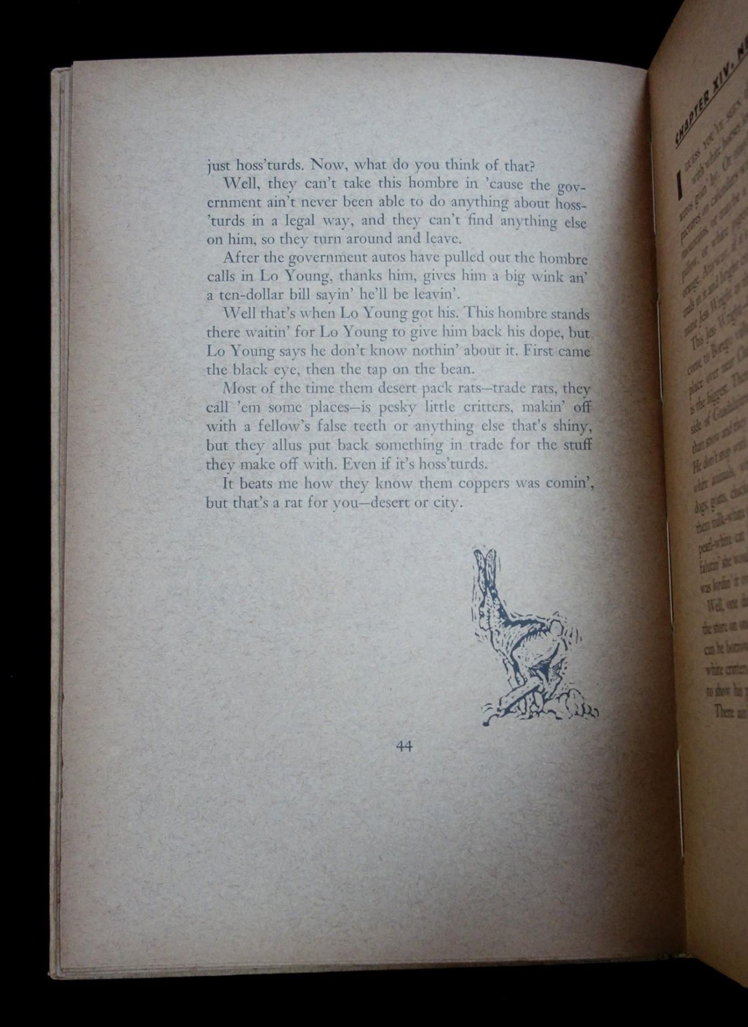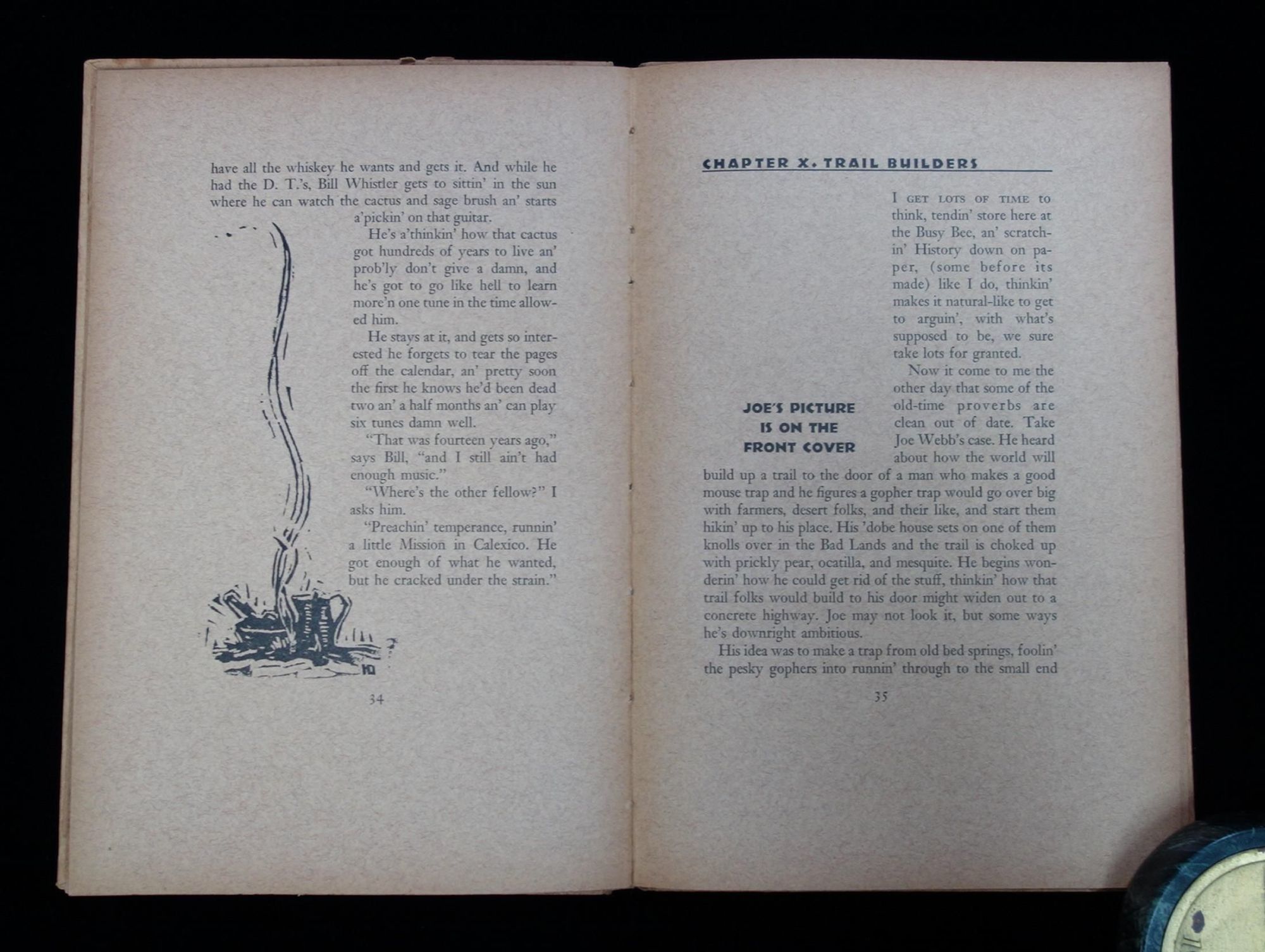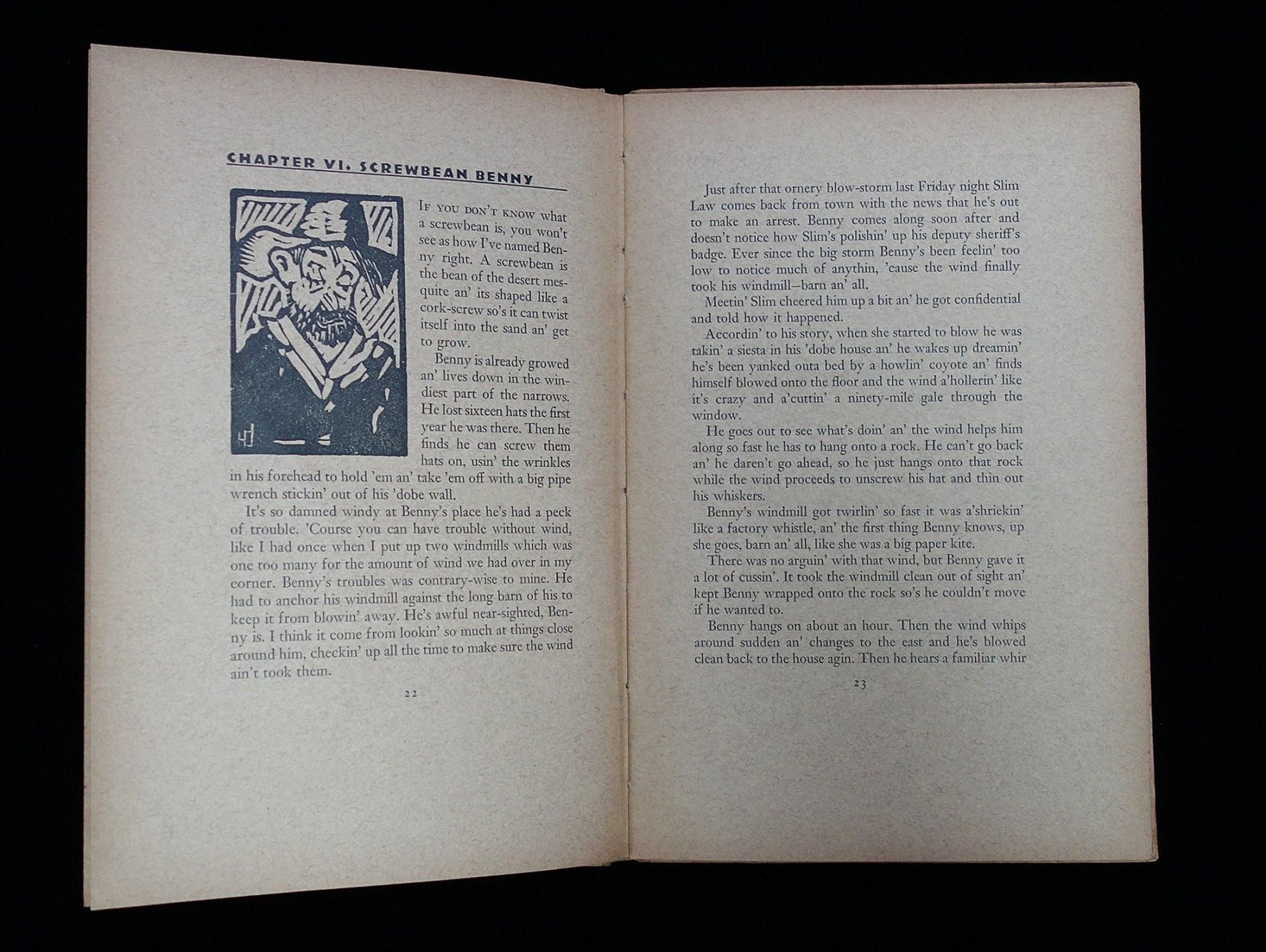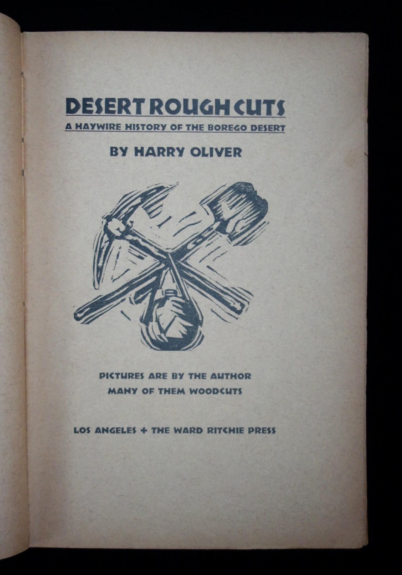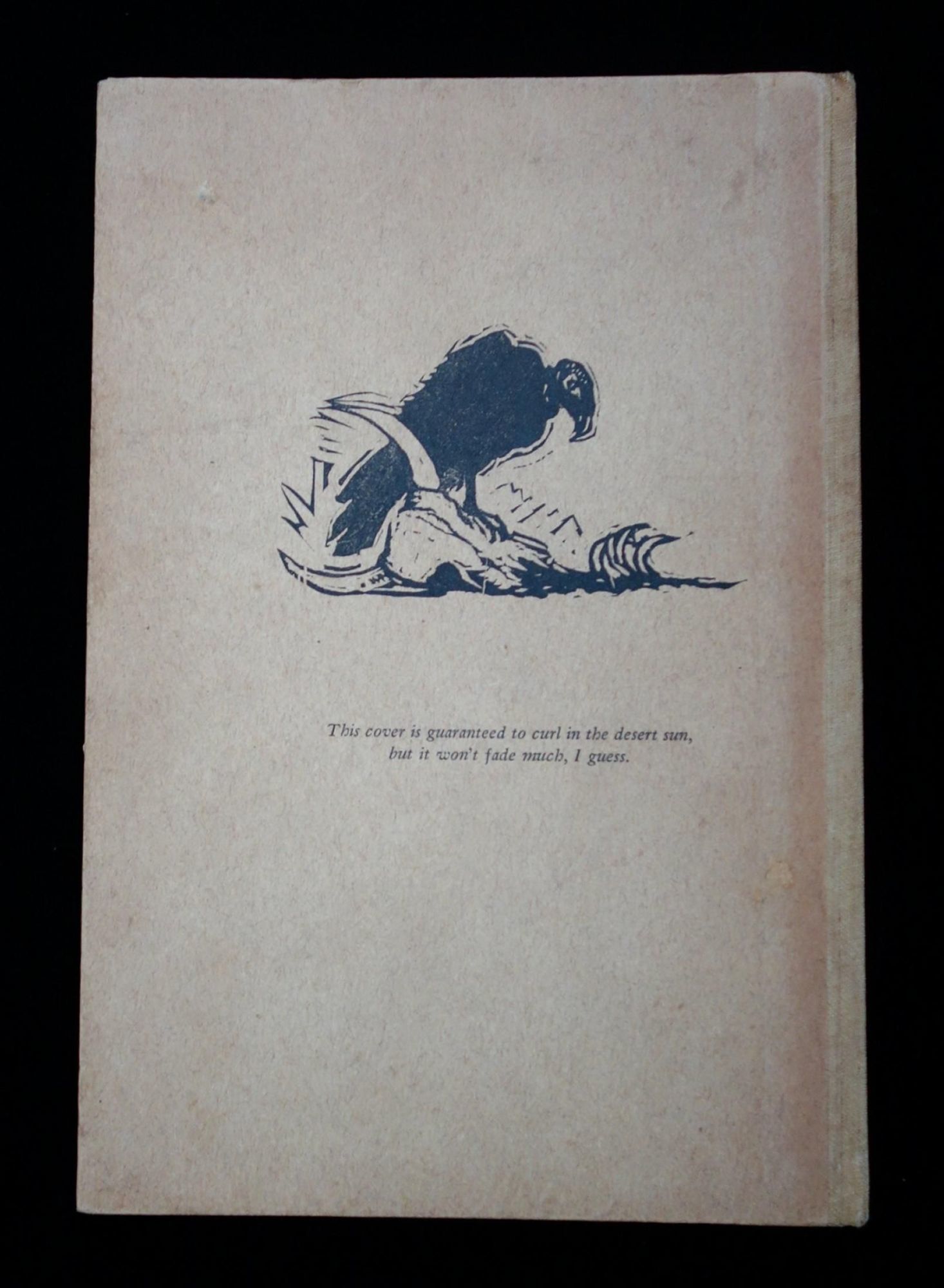 1938: Ward Ritchie Press, Los Angeles. Very Good. 64 pp. illustrated paper covered boards. A humerous history of the Borego Desert. There are twenty (20) chapters with titles like "Gold is Where You Find It", "Music and Booze", "Petrified Pete". There are also thirty-six (36) B&W woodcuts (including the two on the covers). Slight cover wear & rubbing. The covers have faded in places with a small water stain on the top right of the front cover. Binding is loose in some areas. Measures 9 3/4" x 6 1/2",