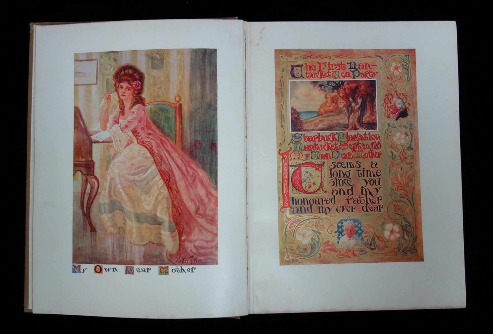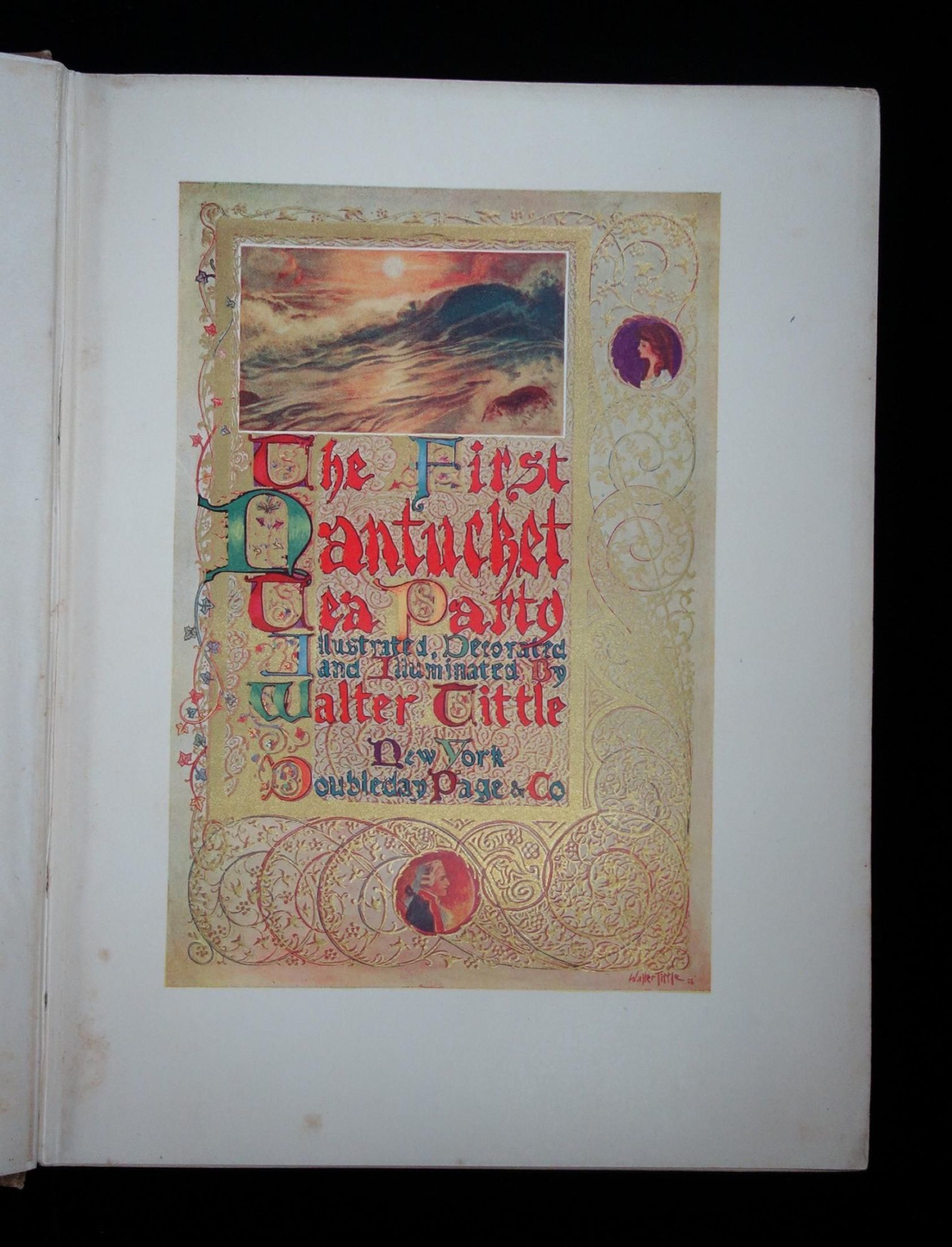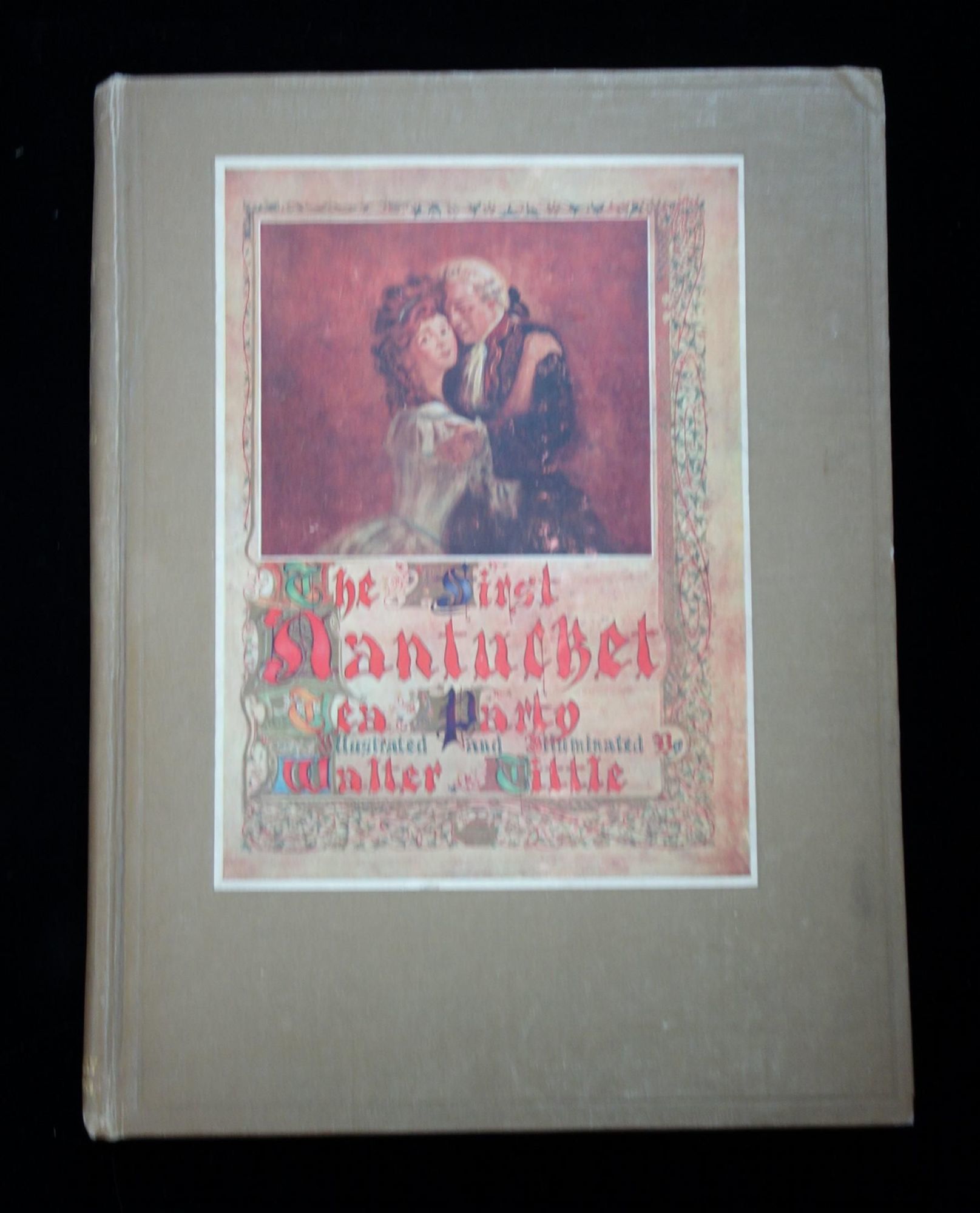 Doubleday, Page & Co, 1907. Good +. New York: Doubleday, Page & Co., 1907. Good +. Walter Tittle. 82 unpaginated pages. Applied litho on cloth. Tells the story of the first tea party on Nantucket in 1745 when Cousin Nate Wenworth returned from his voyage to China and had brought home some green tea. The book is essentially one long letter written by Ruth Starbuck Wentworth to her her mother. Each text page has a green ornamental border. The tittle-page and first page of each chapter is illuminated in gold and with color illustrations. There are also color illustrations of the activities described in the letter. Between the illuminations and the illustrations, there 25 color plates in the book. There is minimal cover wear, with an inscription on the inside front cover, dated Thanksgiving 1907. The first gathering has separated from the binding. Light foxing on select pages, and a few intact tears, none of which effect either the text or drawings. Measures 10" x 7 3/4