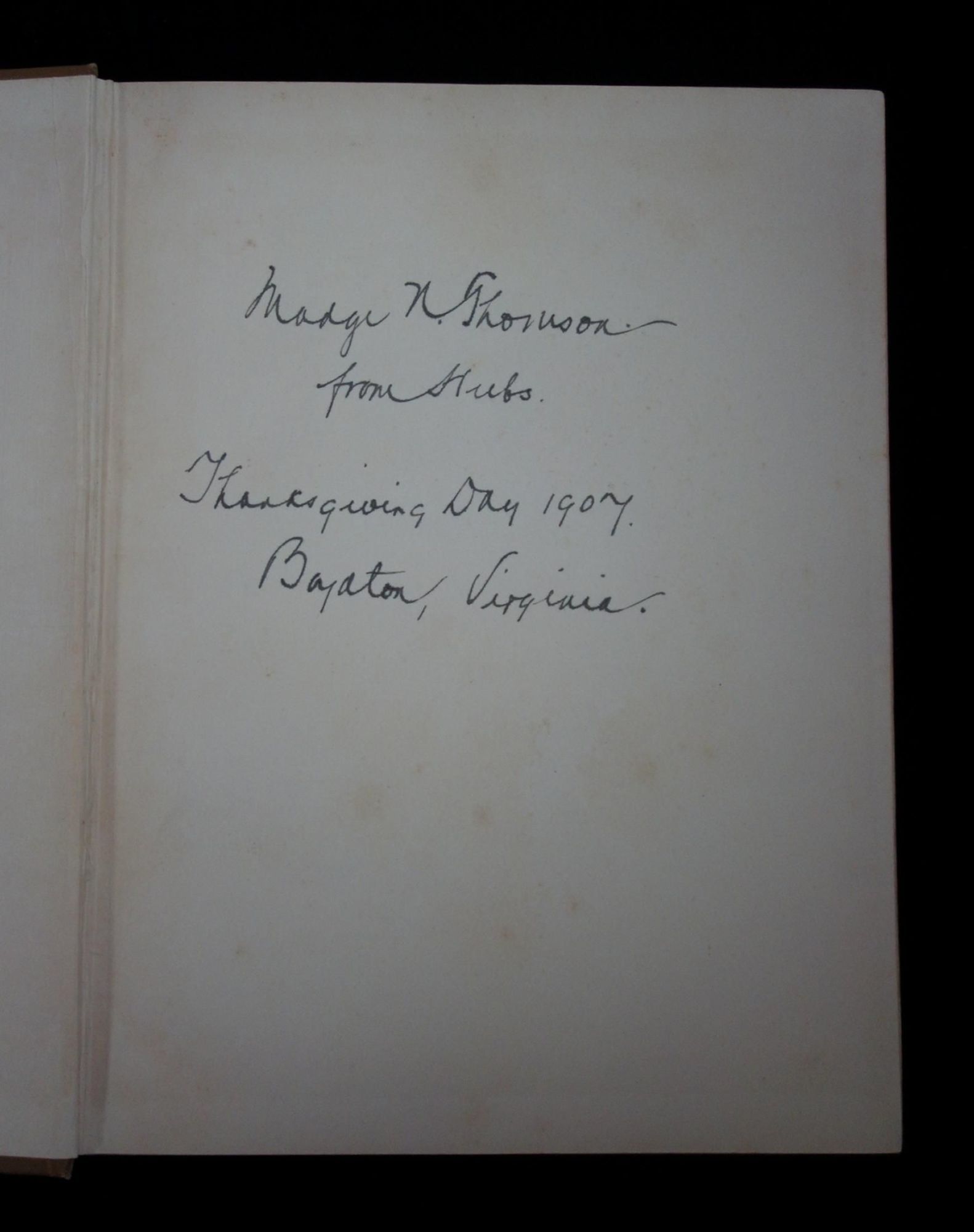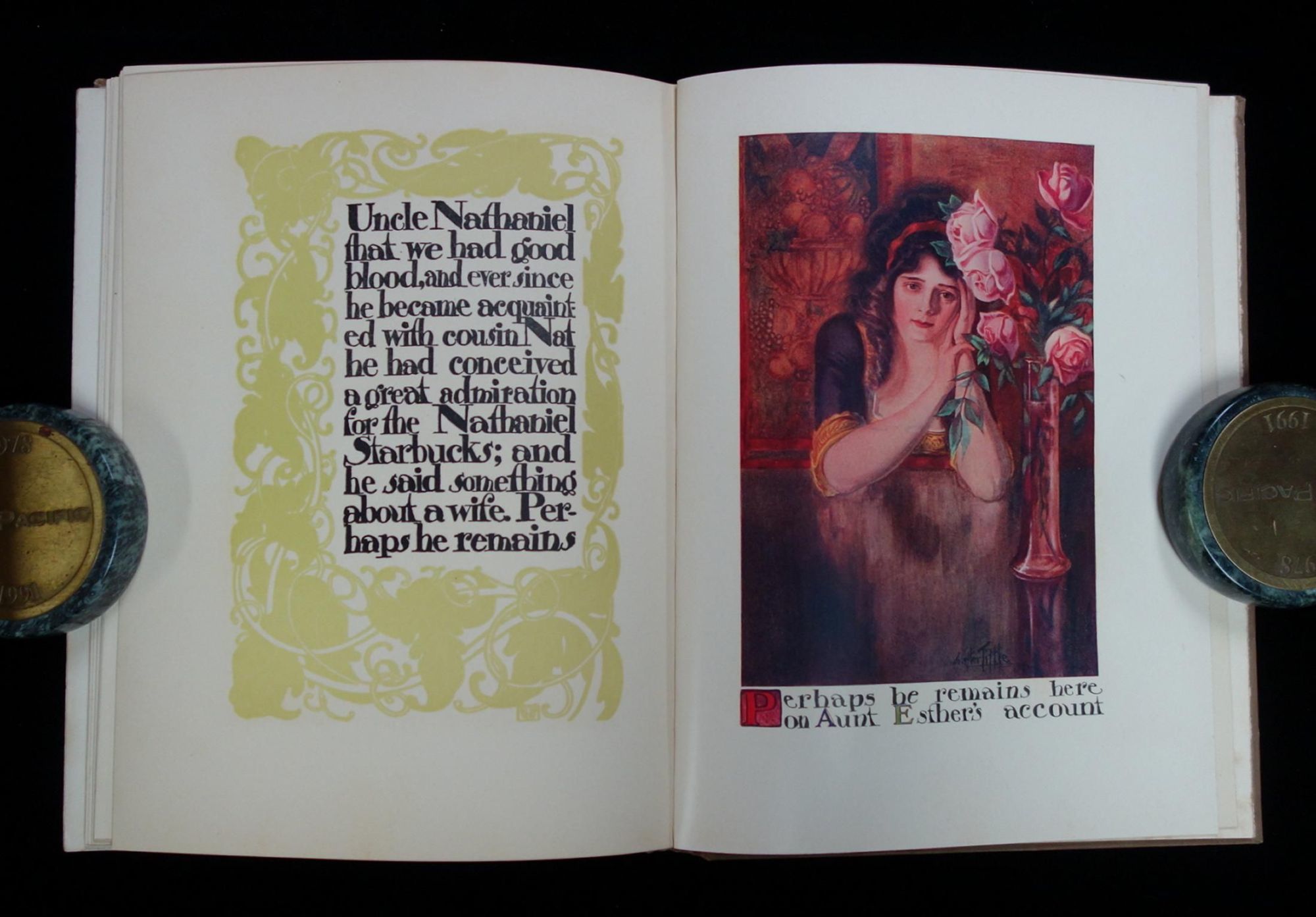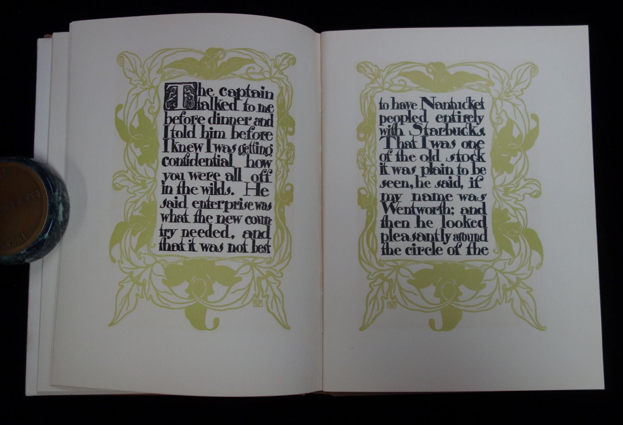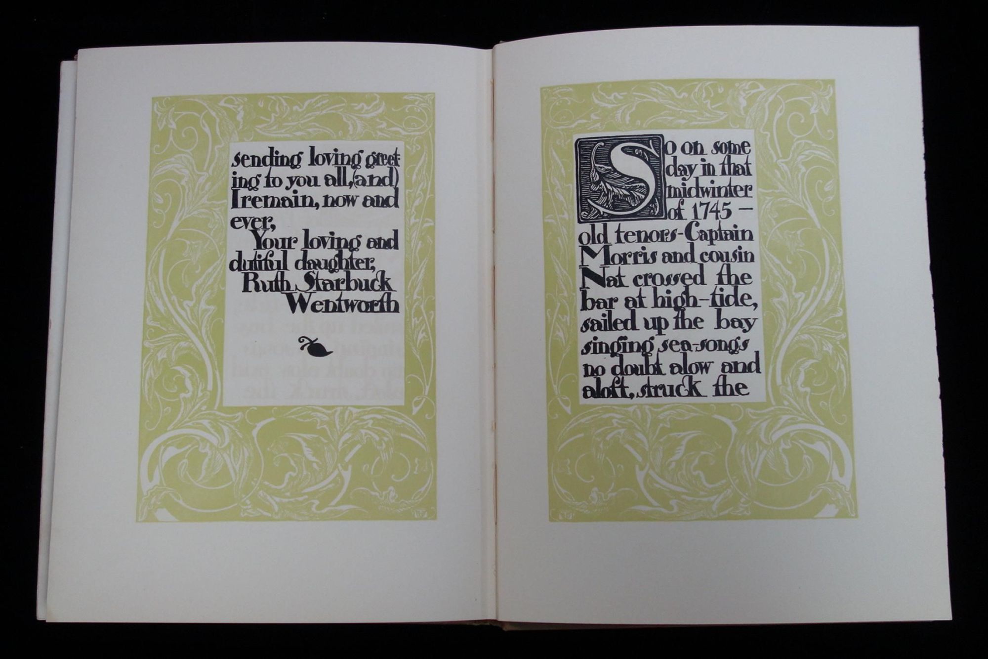 Doubleday, Page & Co, 1907. Good +. New York: Doubleday, Page & Co., 1907. Good +. Walter Tittle. 82 unpaginated pages. Applied litho on cloth. Tells the story of the first tea party on Nantucket in 1745 when Cousin Nate Wenworth returned from his voyage to China and had brought home some green tea. The book is essentially one long letter written by Ruth Starbuck Wentworth to her her mother. Each text page has a green ornamental border. The tittle-page and first page of each chapter is illuminated in gold and with color illustrations. There are also color illustrations of the activities described in the letter. Between the illuminations and the illustrations, there 25 color plates in the book. There is minimal cover wear, with an inscription on the inside front cover, dated Thanksgiving 1907. The first gathering has separated from the binding. Light foxing on select pages, and a few intact tears, none of which effect either the text or drawings. Measures 10" x 7 3/4