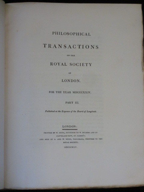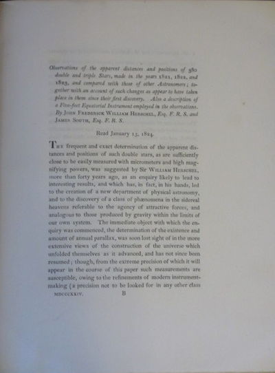 London: Royal Society, 1825. Original Wraps. Very Good+. Offered is a Very Good+ entire Part III of the Philosophical Transactions for 1824 in plain blue wrappers with date in ink spine, small chips spine tips, mild edge wear, small bookstore sticker front paste-down with off-setting ffep. Pages unopened and ucut. Full title "Observations of the Apparent Distances and Positions of 380 Double and Triple Stars, Made in the Years 1821, 1822, and 1823, and Compares with Those of Other Astronomers; Together with an Account of Such Changes as Appear to Have Taken Place in Them Since Their First Discovery. Also a Description of the Five-Feet Equatorial Instrument Employed in the Observations." 4to. Double stars, essentially discovered by William Herschel were of great interest throughout the nineteenth century - new ones being found and postition measurements made more precise with each improvement in telescope construction. South, working with John Herschel during the years 1821-1823, re-observed the double stars charted originally by William Herschel, mainly for the purpose of detecting position changes. Their observations helped verify the newly recognized orbital motion of these neighboring stars. Their resulting catalog of 380 double stars, presented to the Royal Society in 1834, earned them the gold medal of the Astronomical Society and the grand prize of the Institute France. (DSB 12, p. 552).