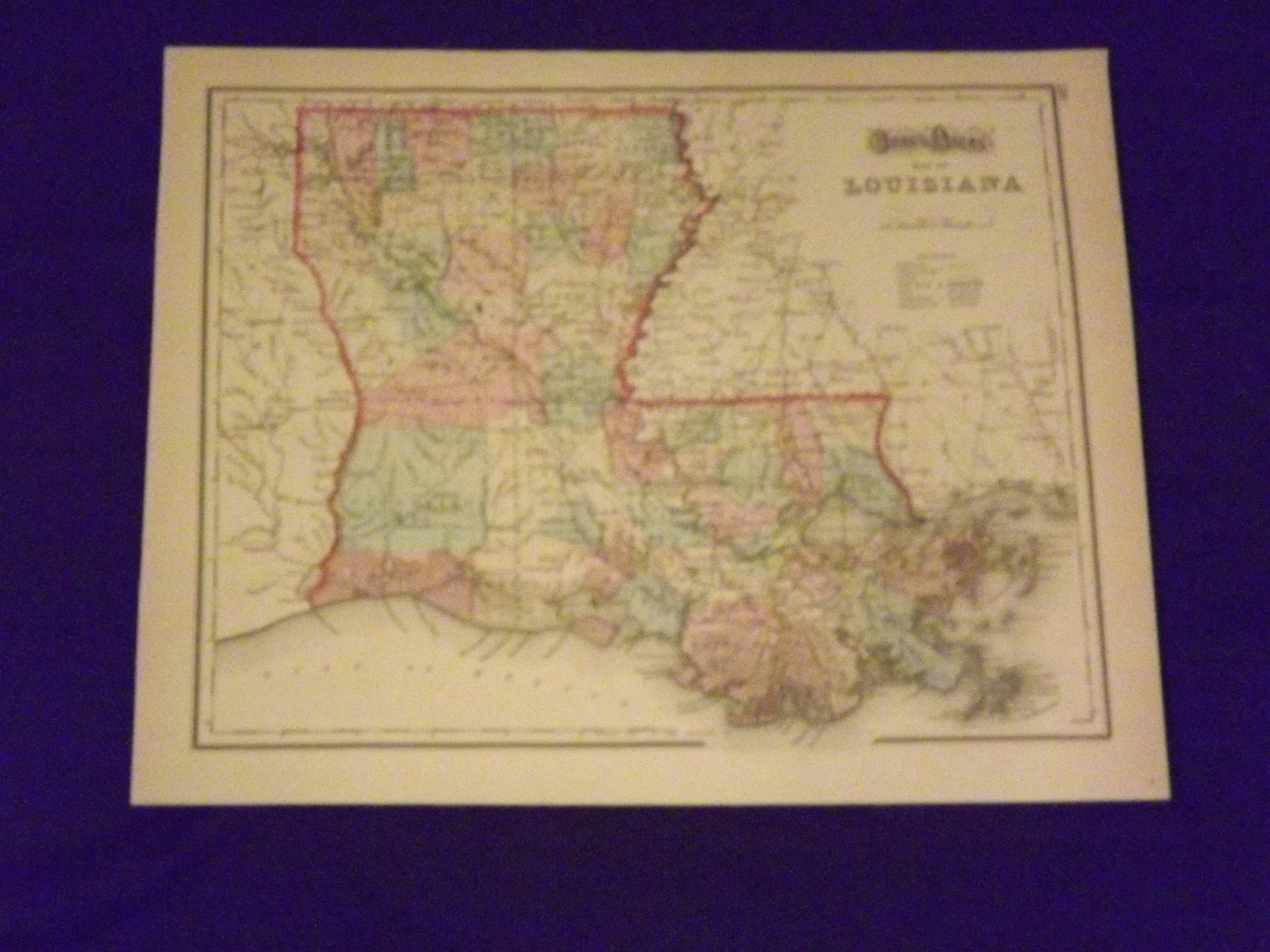 Unbound, removed, 16" x 13", colored, straight line border. Slight aging; otherwise bright and clean. Very good plus. Published in the 1873 installment of Gray's Atlas of the United States, this is an attractive and colorful map of Louisiana.. There is plenty of detail, and the state of Mississippi is on the reverse side.
