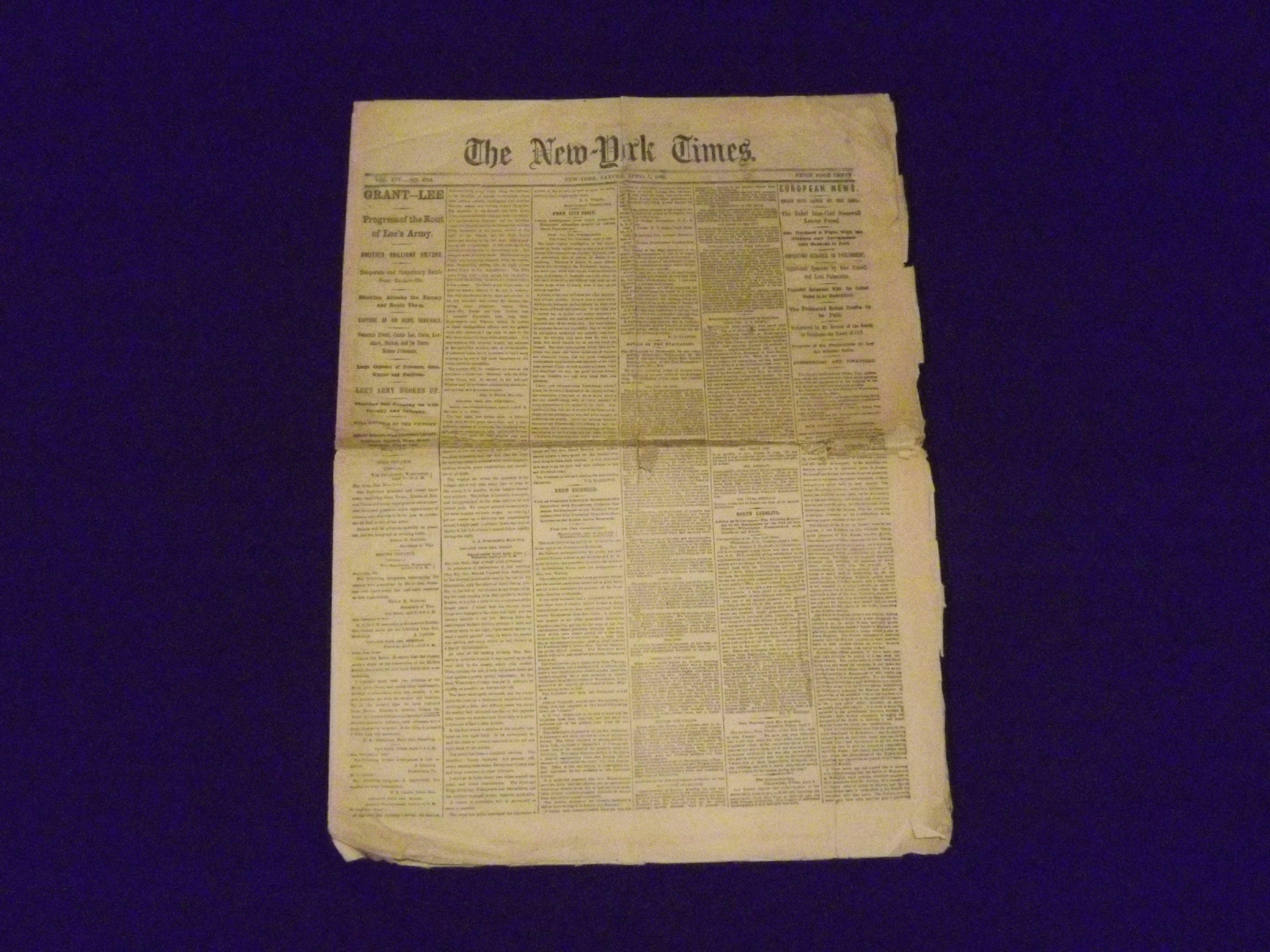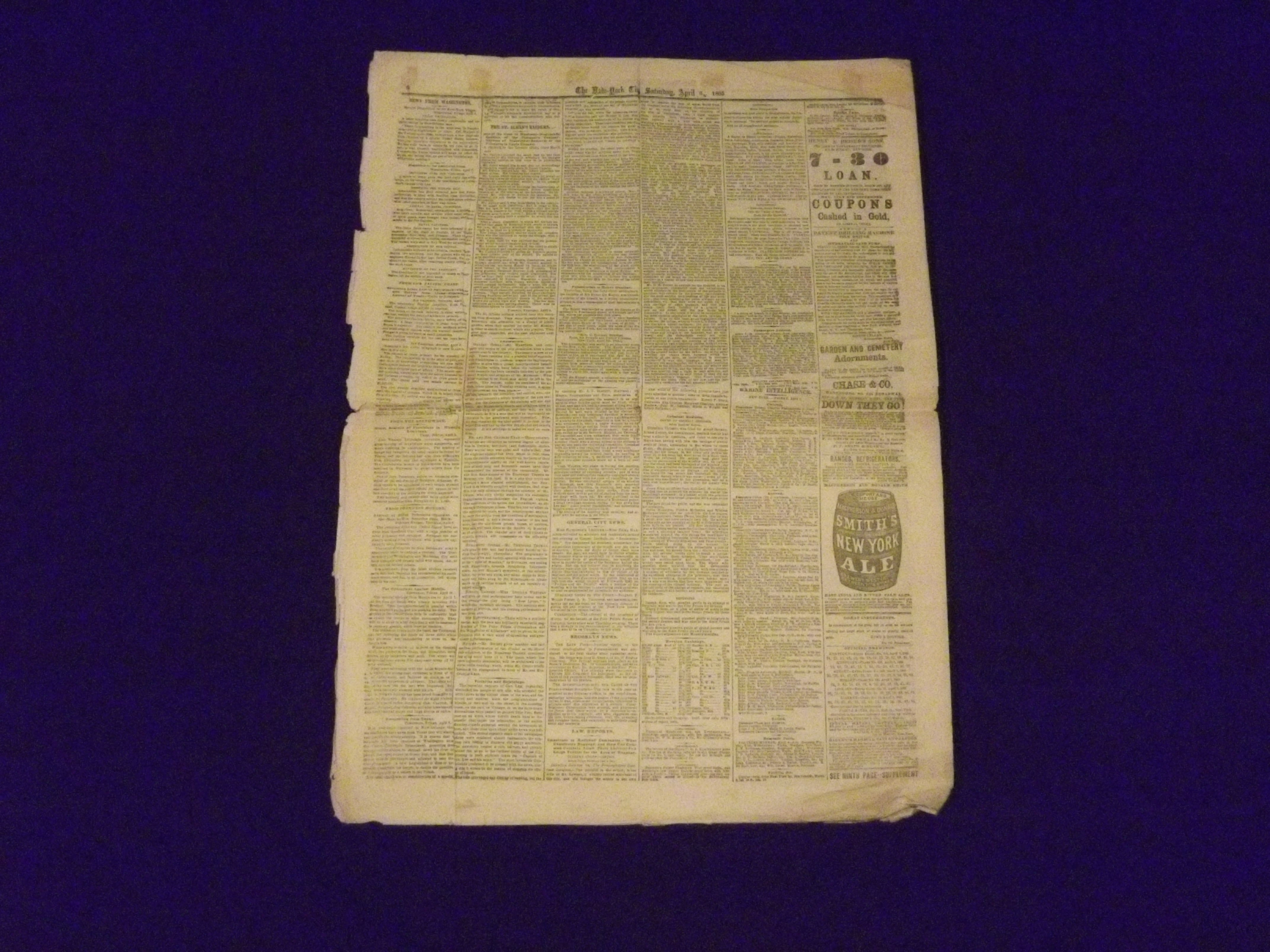 Newspaper, folded, six columns, 8 pp. Some splits and tears at folds with some loss of text, a couple of small pieces are missing, creasing and chipping, mostly in margins, paper in a somewhat fragile state. Paper is folded in half at this point. Overall condition fair for newsprint. An exciting piece of Civil War history published the day before Lee surrendered. The paper is full of Civil War coverage including the capture of six Confederate Generals, Sheridan's route of a rebel army, and Lee's army broken up. The Times article talks of victory, and the demise of the Confederate army. This issue is at the end of the Civil War, and about a week before Lincoln would be assassinated.