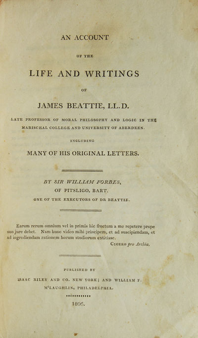 New York: Isaac Riley and Co, 1806. First American edition, With the second half-titles and the 2 leaves of errata and. 559 pp. 8vo. Full tree calf. Fine. Signed by William Lord Boston April 1817 on ffep. First American edition, With the second half-titles and the 2 leaves of errata and. 559 pp. 8vo. This biography of Beattie is made up of letters from Beattie put together by Coutts banker Sir William Forbes.
