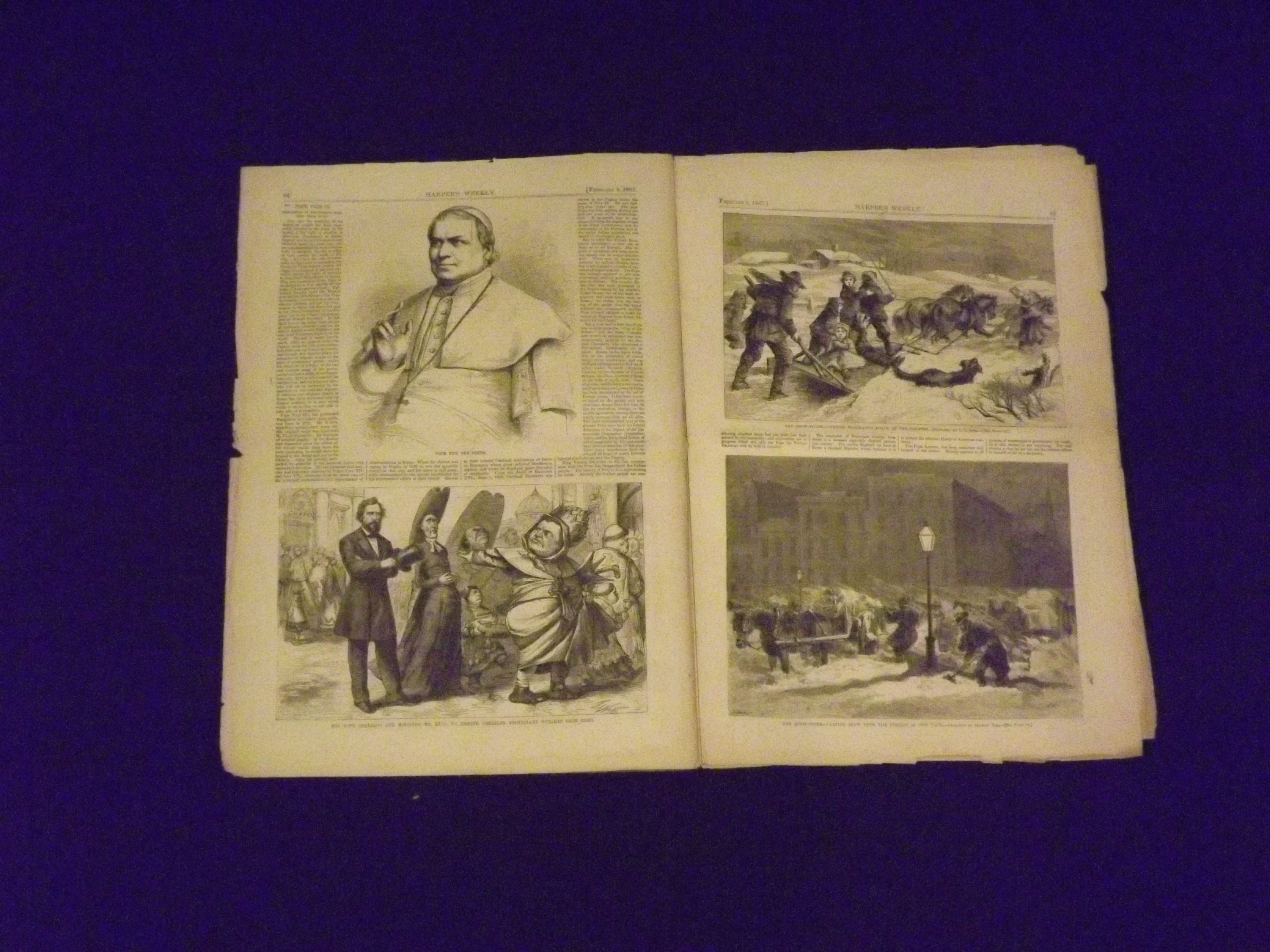 Folio, newspaper, illustrated, 81-96 pp. Chips and small tears in margins, a little creasing, slight foxing, aging and browning; otherwise very good. This is a well-illustrated issue with a number of wood engravings, including a map of shipping lanes. More importantly, this issue includes a full page Thomas Nast cartoon about corruption in New York City. A second Nast cartoon has an anti-Catholic theme. A couple of illustrations focus on the effects of a New York City snowstorm.