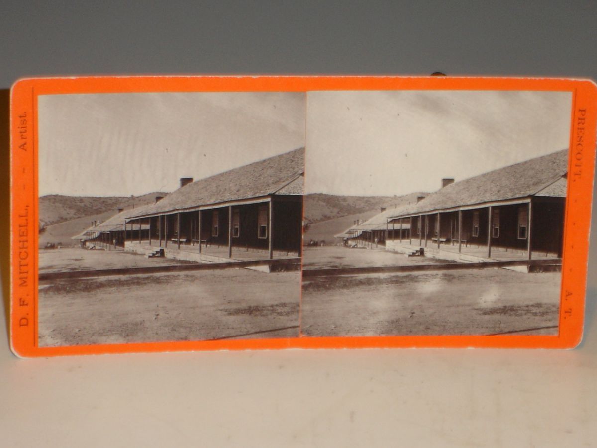 A pristine stereographic card taken by Daniel Francis Mitchell who photographed Arizona views for sale from 1877.  Mitchell also was in partnership with Baer and remained active in the territory until at least 1883.   Accompanied with an envelope from the War Department Headquarers of Arizona addressed to Major A.J. McGonnigle, Chief Quartermaster, [Fort] Whipple, postmarked March 16, 1885. This was a turbulent time since on July 13 he had to report to the Quartermaster General of the U.S. about Samuel Drachman's failure at Fort Huachuca where what the latter did amounted to  taking kickbacks of more than $40 on each 100 pounds of hay. Eventually, Drachman was only sued for $475 but it was a blot on his record.   Of course, it should be noted that the parade of quartermasters at Fort Whipple were accused of the same thing such as declaring weapons obsolete and then selling them to the local Prescott merchants.   This charge was never proved and since the Fort was considered essential in suppressing Indian attacks, it was overlooked.   Verso of card notes discarded as a duplicate from Sharlot Hall Museum in Prescott.