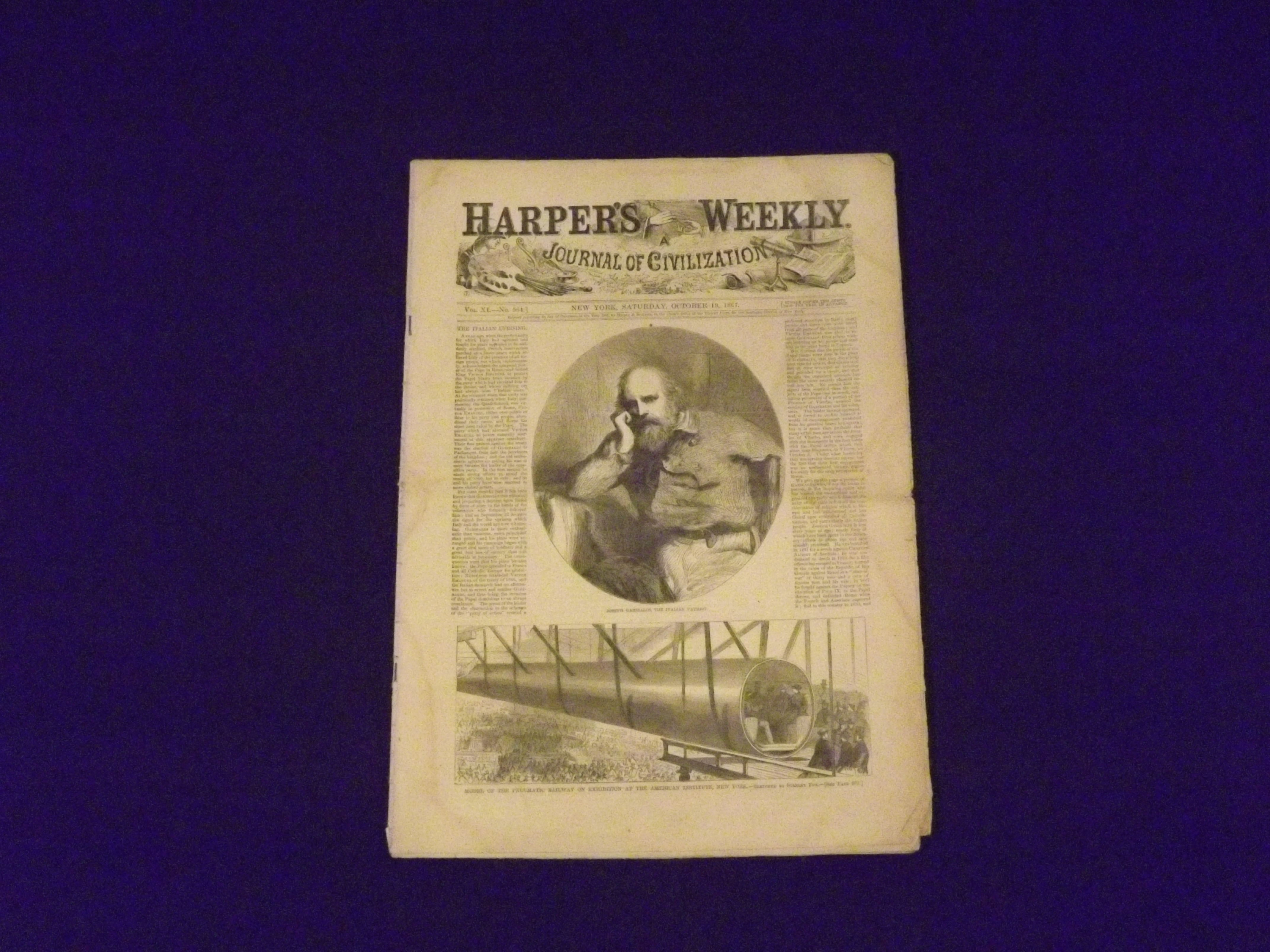 Folio, newspaper, illustrated, 657-672 pp. Chips, small tears and folds in margins and edges, a little soiling and darkening, normal aging; otherwise very good. The cover feature for this week's Harper was on Garibaldi and his efforts to bring a just government to Italy. He is presented in a wood engraving on the front page. Also on the front page is an illustration of a pneumatic railway, which was part of an exhibition at The American Institute in New York. There is a short article on the invention's potential. This issue includes several large wood engravings, including one on a reception for General Sheridan in Union Square.
