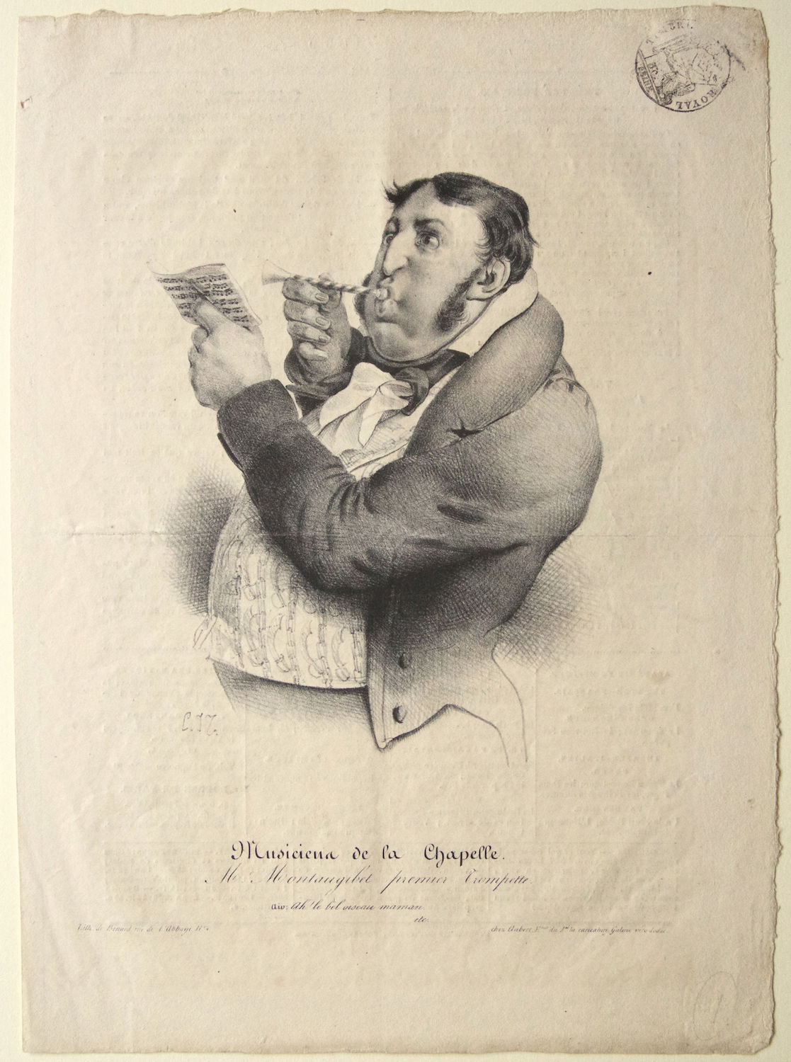 Musiciens de la Chapelle. M. l'Abbé Loup. M. Montaugibet, premier Trompette. aiv: Ah! le bel oiseau maman. Lithograph by Benard after Charles Joseph Traviès de Villers depicting a rather large gentleman in formal dress, half-length, playing a tiny toy trumpet, music in hand