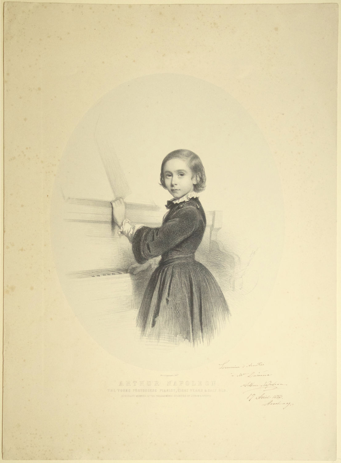 Fine large lithograph by Charles Baugniet (1814-1886) of the Portuguese child prodigy pianist and composer aged 8-1/2. With an autograph inscription signed "Arthur Napoleon" and dated April 17, 1856, Strasbourg in ink to lower right portion of mount