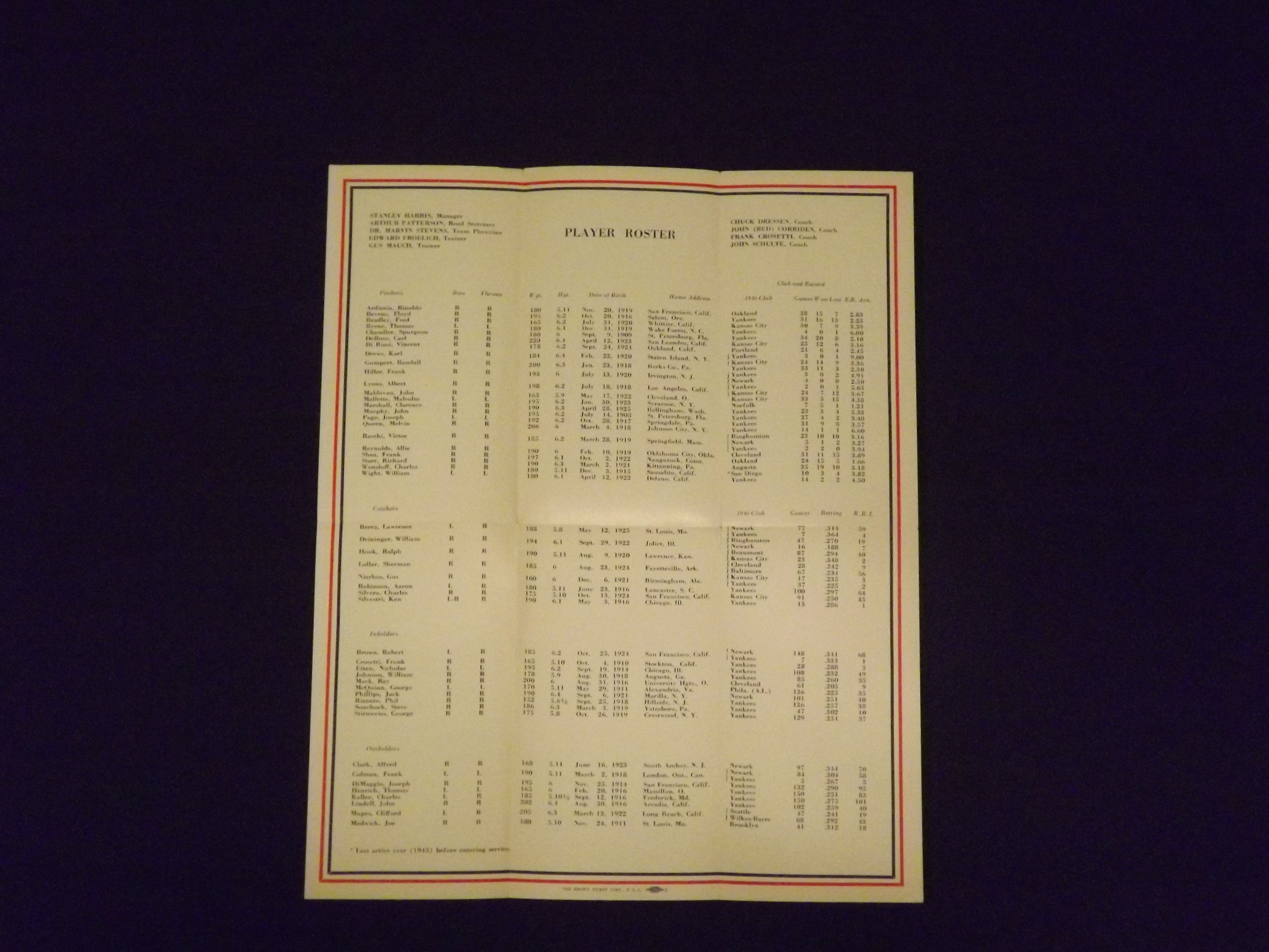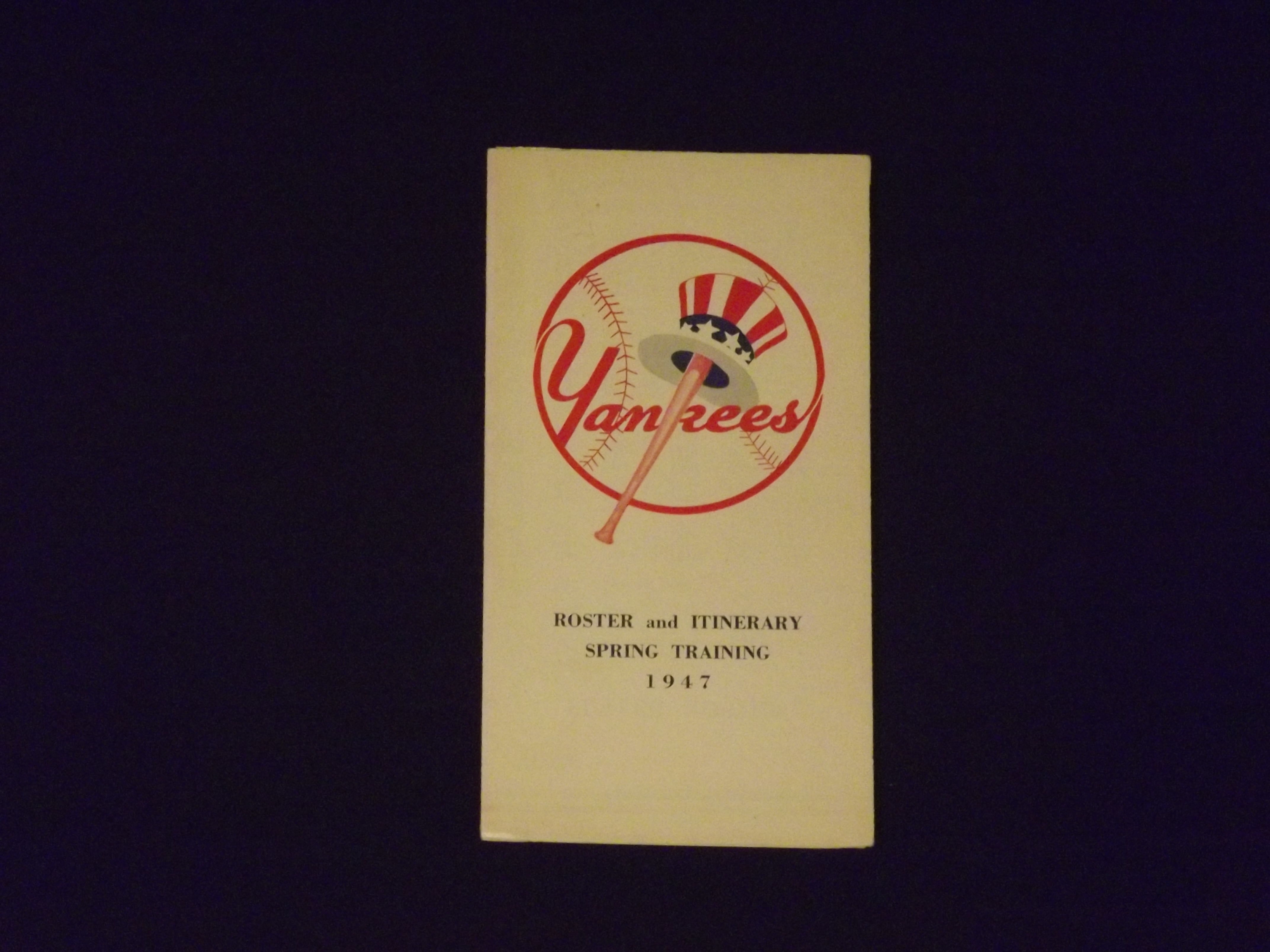 Folding roster, small 8vo, team logo on front page, folds out to two larger sheets with lists of information. Some aging and darkening, small nick in upper margin; otherwise very good. Scarce Yankee roster for the 1947 season. Lists the entire team by position, and gives stats for the previous season. The roster lists Stanley Harris as manager, and key players include Yogi Berra (1947 was his first full season), Joe DiMaggio, Phil Rizzuto and Ralph Houk. The roster also provides the Spring Training Schedule, and the Yanks actual schedule for the 1947 season. Also lists Yankee pennant winner seasons, and when they were world champions.