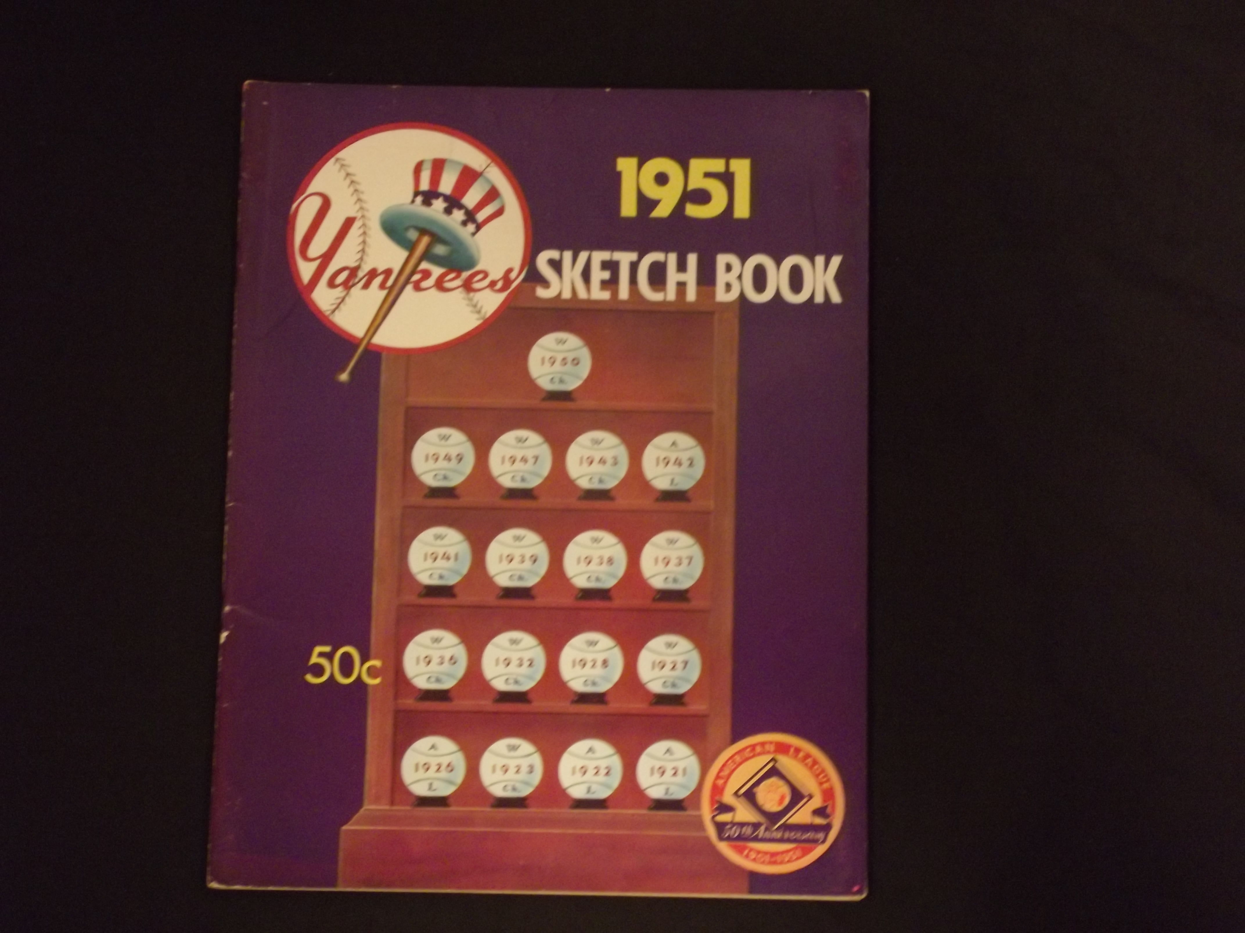Magazine format, 8 1/2/ x11, illustrated, 48 pp. Some aging, a little edgewear, a couple of minor marks or light stains to back cover; otherwise in excellent shape. This 1951 Yankee Sketch Book features players, records, management and history. Many pictures of featured players including, Joe DiMaggio, Phil Rizzuto, Tommy Hendrich, Yogi Berra, Jerry Coleman, Hank Bauer, and Billy Martin. Provides records for each player. Picture of Joe DiMaggio signing $100,000 contract in 1949.