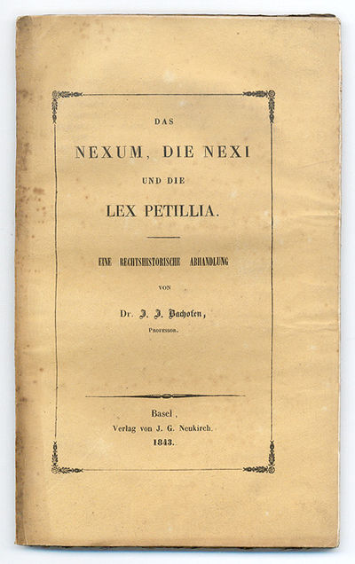 1843. Basel, 1843. Only edition. Basel, 1843. Only edition. The Roman Law of Parent and Child Bachofen, Johann Jakob [1815-1887]. Das Nexum, die Nexi und die Lex Petillia: Eine Rechtshistorische Abhandlung. Basel: Verlag von J.G. Neukirch, 1843. [ii], 160 pp. Octavo (8-1/2" x 5"). Original printed publisher wrappers, unopened signatures. Some rubbing to edges, light soiling and faint dampspotting, spine darkened. Moderate toning and occasional light foxing to text. $750. * First edition. Bachofen, a founder of the German Historical School, is best known as the author of Das Mutterrecht (1861), a ground-breaking history of the family as a social institution. An early example of his work in this field, Das Nexum deals with the Roman law of parent and child. OCLC locates no copies in North America. British Museum Catalogue (Compact Edition) 2:79.