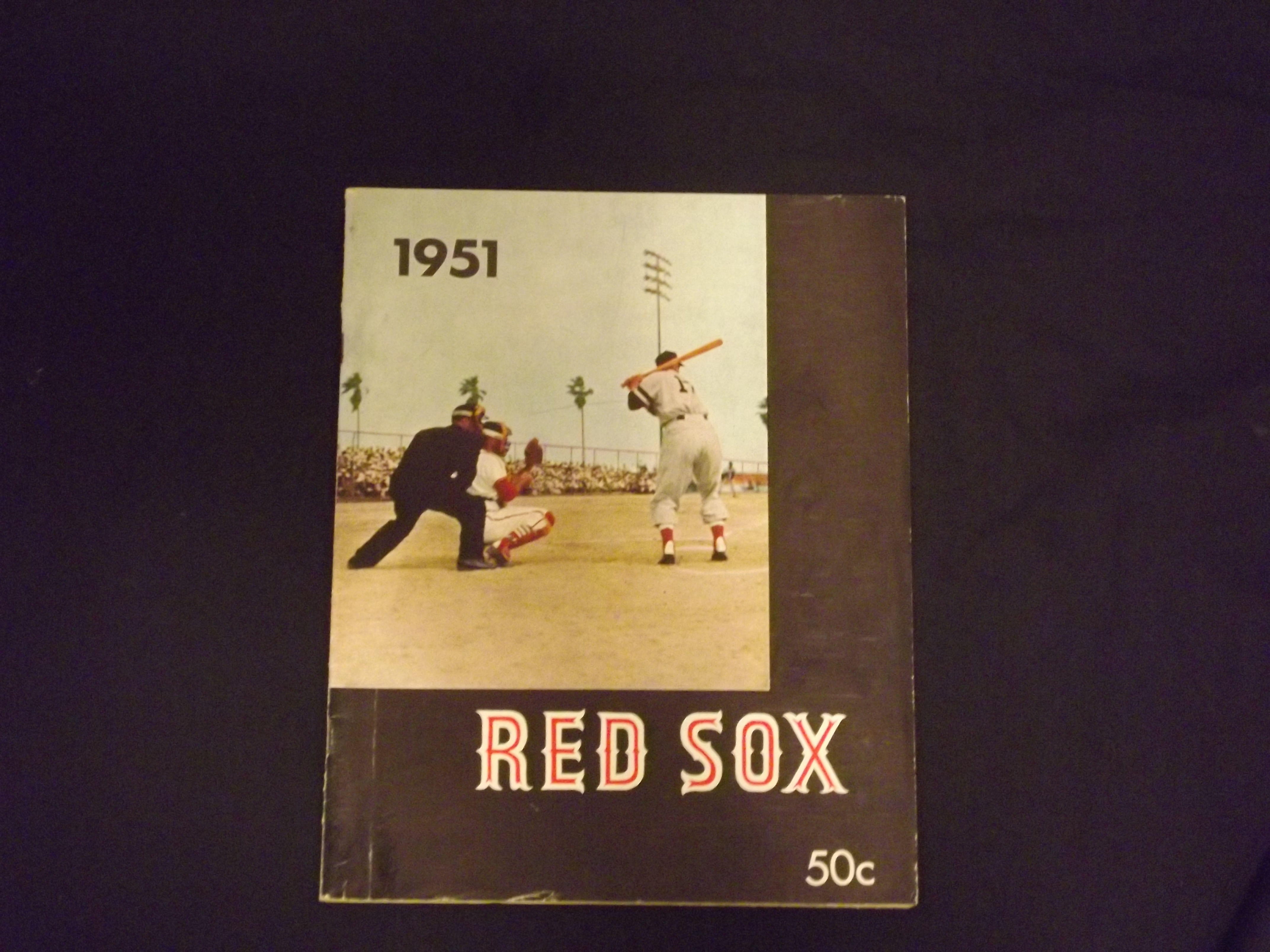 Program format, 8 1/2 x 11, paper, illustrated, 48 pp. Some slight aging, some edgewear, a little soiling to back cover; otherwise very good plus. The 1951 Boston Red Sox Yearbook features pictures, profiles and records of players on the 1951 team. Featured players include Ted Williams, Johnny Pesky, Dom DiMaggio, Vernon Stephens, Ellis Kinder, and Jimmy Piersall. This is a Red Sox classic issue with some of their best players from that era.