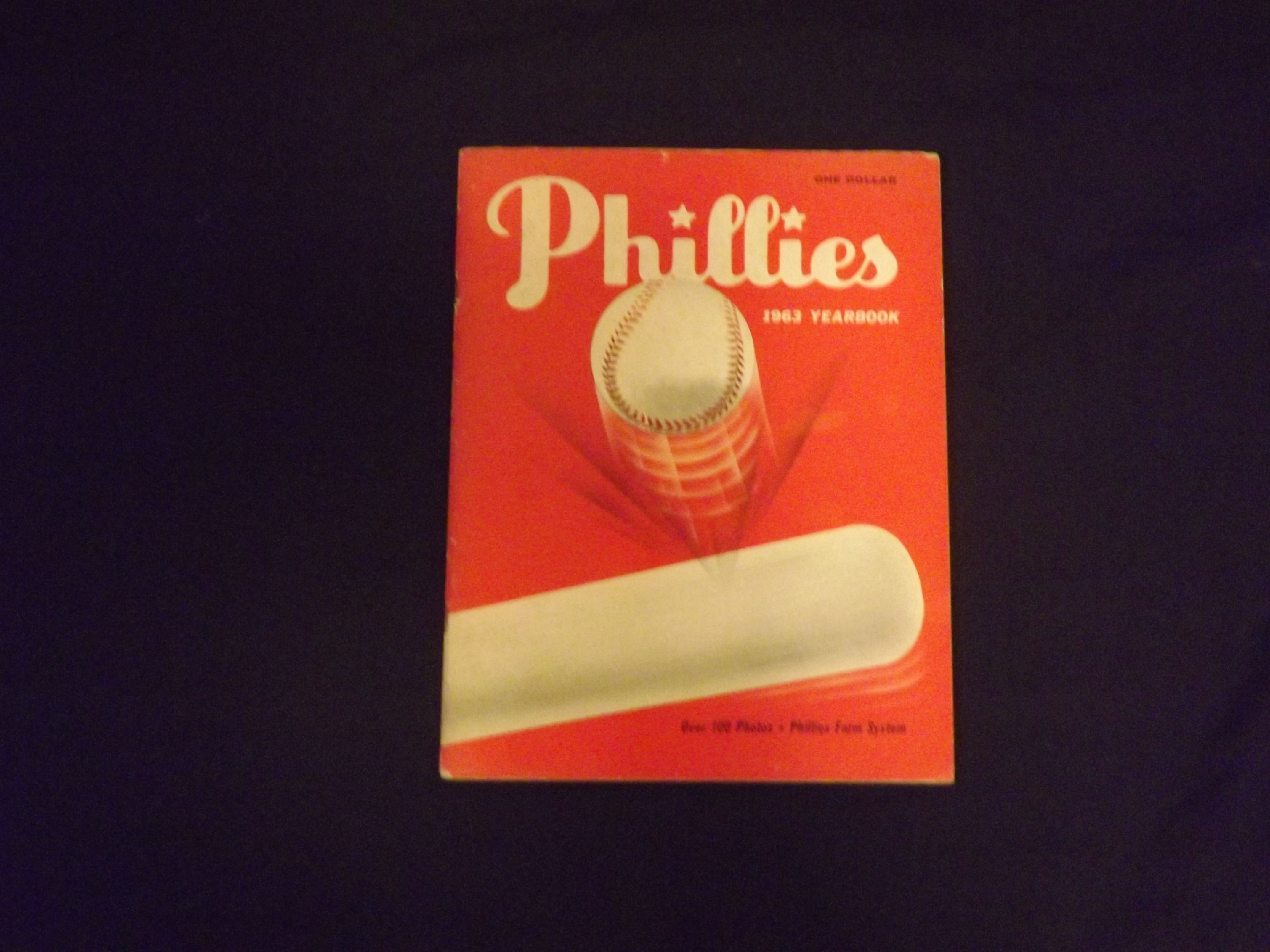 Program format, 8 1/2 x 11, paper, illustrated, 42 pp. Some aging and edge and spine wear, a little soiling on rear cover; otherwise very good. The 1963 Philadelphia Phillies Yearbook provides team history, pictures, profiles, and records of team players. Featured players include Tony Gonzales, Cookie Rojas, Art Mahaffey, Cal McLish, Ruben Amaro, Tony Taylor, Bobby Wine, and Roy Sievers. The last couple of pages review National League stars of 1962.