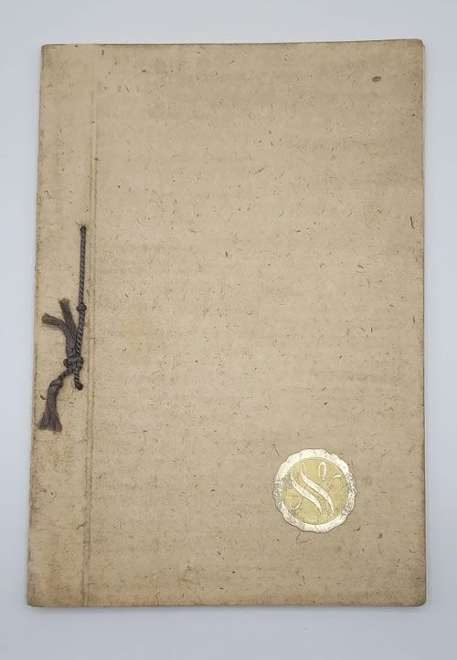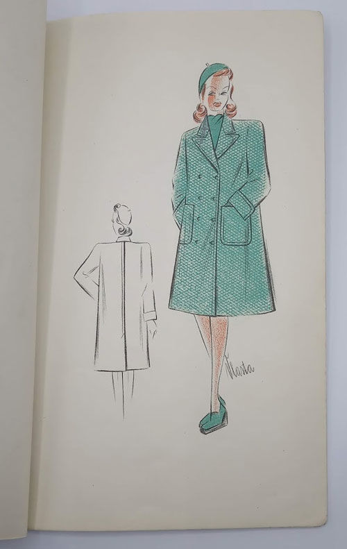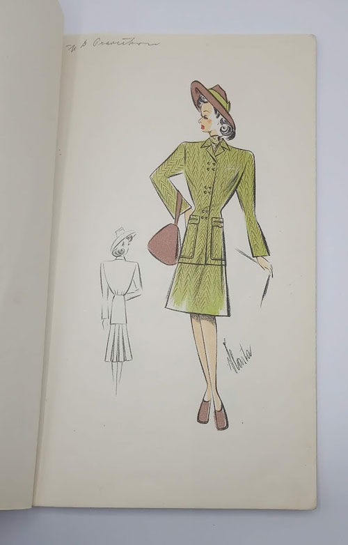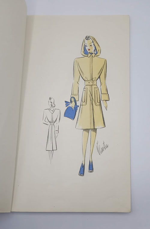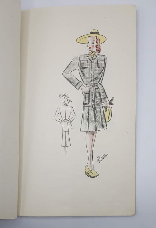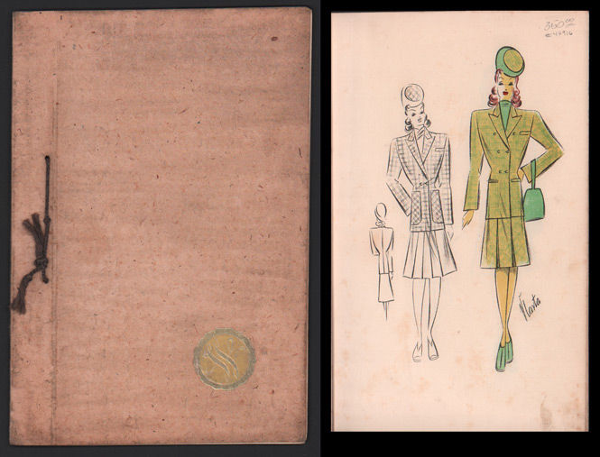 Praha (Prague): C. Wolfrum, 1937. First edition. Paperback. Very good. Vlasta Novakova. Very slim quarto [30.5 cm] Original beige handmade paper wraps, bound with a stringtie binding and three punch holes, and with the Wolfrum gold monogram on the front cover. Eighteen leaves with color lithograph fashion illustrations on every leaf. Light dust soiling on the wraps; some occasional thumbing in the margins of the pages; minor markings and notations in pencil here and there. A first edition of this scarce original trade catalogue issued by the C. Wolfrum textile firm in Czechoslovakia, and featuring the "Chic Parisien" line created by Vlasta, an in-house designer. The designs in this catalogue highlight the growing influence of militaristic styles, such as square-edged shoulder pads, plate hats, and an emphasis on tight waists and long skirts.
