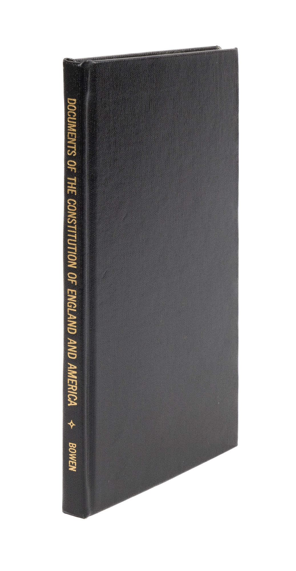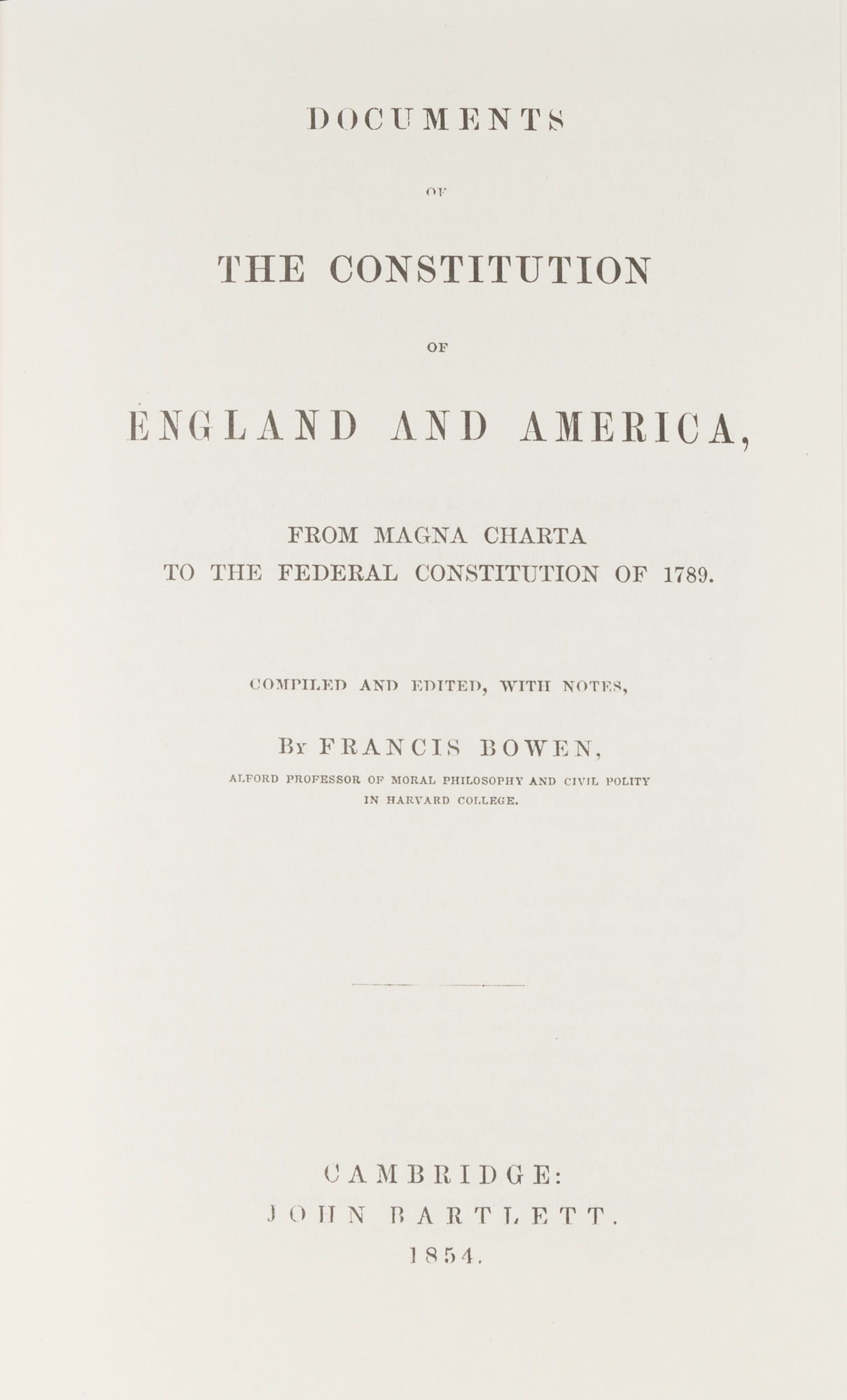 1993. Bowen, Francis. Documents of the Constitution of England and America, from Magna Charta to the Federal Constitution of 1789. Cambridge: John Bartlett, 1854. Reprinted Littleton, Co.: F.B. Rothman, 1993. vii, 142 pp. Cloth. New. $48. * Compiled for easy reference of texts from the national Constitution, along with individual state constitutions.