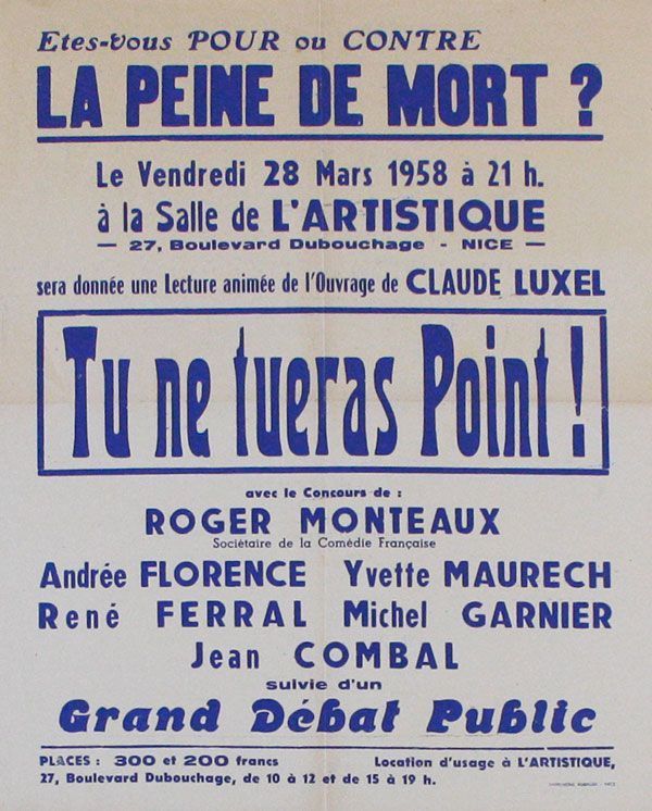 Nice, France: Imprimerie Robaudi, 1958. First Edition. Original poster printed offset in bright blue on white newsprint, measuring 55.75x45.25cm.; a bit of age-toning, faint ironed-out mail folds, else Very Good to Near Fine. Flyer announcing a lecture to be followed by a debate regarding capital punishment in France, held at the Salle de l'Artistique in Nice, March 28, 1958. The lecture, "Tu Ne Tueras Point!" (Thou Shalt Not Kill!) was delivered by the rather laconic author and screenwriter Claude Luxel, known for his hand in co-writing Henri Decoin's 1949 film noir "Entre Onze Heures et Minuit" (Between Eleven and Midnight), and a few mystery stories and novels. The flyer also advertises a debate to follow featuring French actors and actresses, mostly of the stage, including Roger Monteaux of the Comédie Francaise; Andrée Florence; Yvette Maurech; René Ferral, Michel Garnier, and Jean Combal. A hot topic during the 1950s thanks in part to the author Albert Camus and as the prevalence of imposing capital punishment (usually in the form of the guillotine, though occasionally by firing squad) waned. 22 people were executed between 1959 and 1981, when the penalty was abolished, with the last taking place in 1977. This poster apparently unrecorded with no holdings in OCLC, nor does Luxel's talk appear to have ever made it into print.