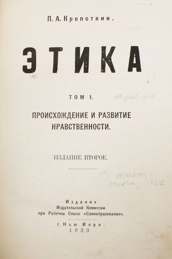 First American edition of what Kropotkin's editor Lebedev called “the swan song of the great humanitarian scientist and revolutionist-anarchist, [constituting] as it were, the crowning work and the résumé of all the scientific, philosophical, and sociological views of Peter Alekseyevich Kropotkin" (from Lebedev's foreword, as translated by Louis Friedland for the 1924 English-language edition). That this major work of anarchist philosophy had its first American incarnation in a Russian-language edition testifies to the still-powerful influence of the Russian exile intellectual community in the years immediately following the Revolution. A very nicely preserved copy of a major (and uncommon) Kropotkin work.