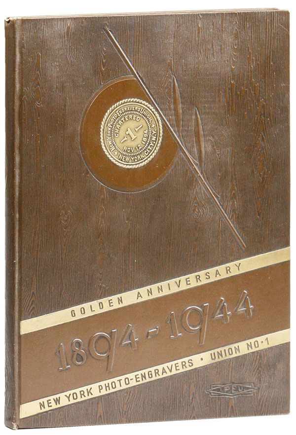 New York: New York Photo-Engravers Union No. 1, 1944. First Edition. Quarto (28.5cm.); original brown blind- and gilt-embossed cloth; unpaged; illus., mostly photographic, a few in color. Boards a bit rubbed, else Near Fine. Scarce WW2-era year book honoring current and former members of the Union, including those who were serving the country as well as members who served in WW1. Quite attractively produced and compiled by Edward White, Union President. OCLC locates 5 copies.