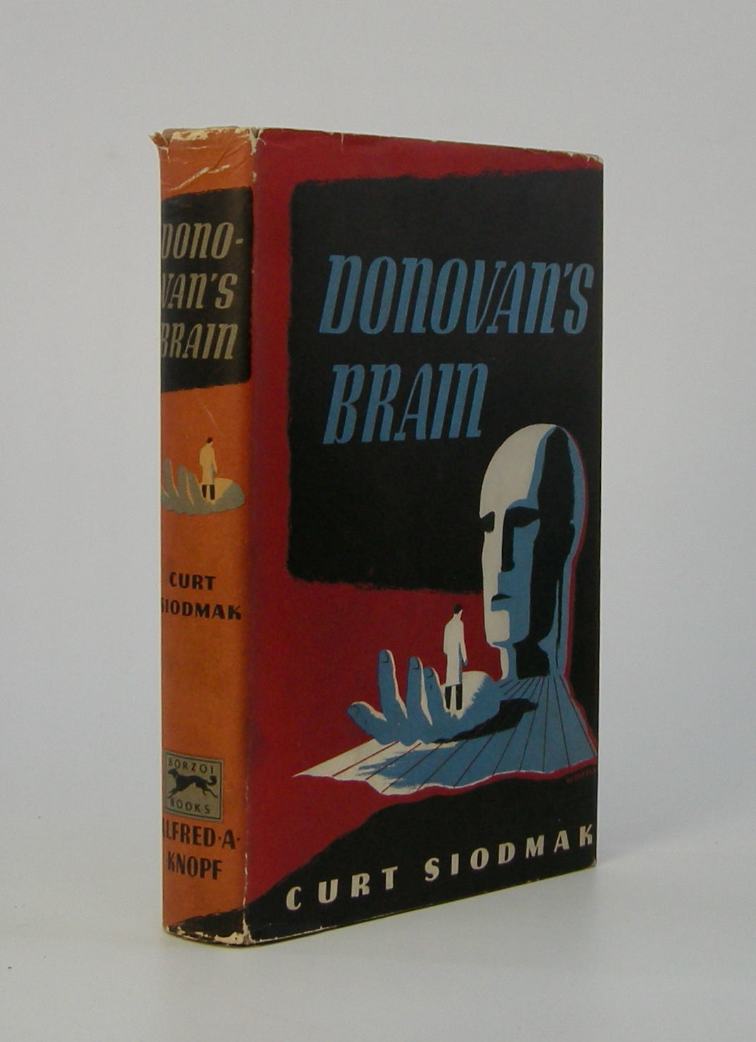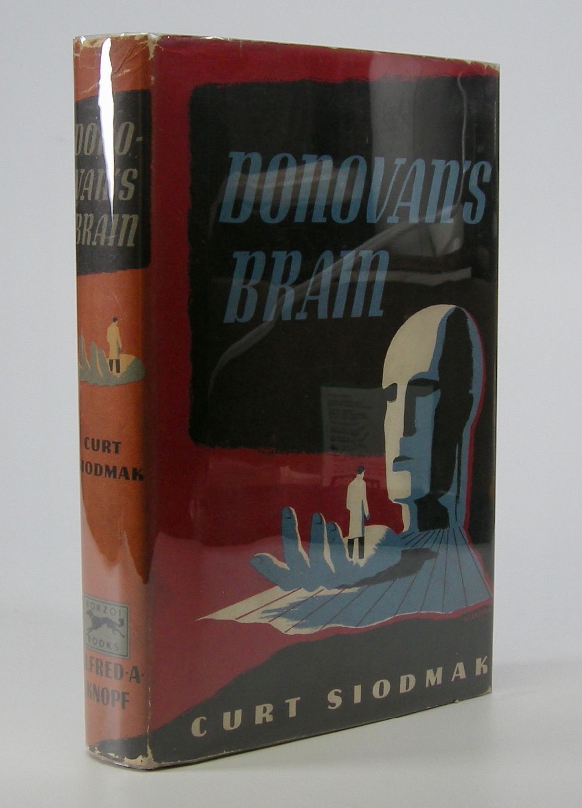 New York: Alfred A. Knopf, 1943. First edition. Light shelf wear along bottom of boards, otherwise about fine in a lightly used but bright graphic dust jacket, slightly worn at spinal ends and with some areas of discoloration on the underside and flaps from where a previous protective plastic cover was affixed.. 8vo, 234pp; cloth. A science-fiction cult classic by the German emigre, and younger brother of the director Robert Siodmak, Dononvan's Brain was adapted for the screen three times. Its principal device of a disembodied brain kept alive and functioning has served in numerous other narrative contexts.