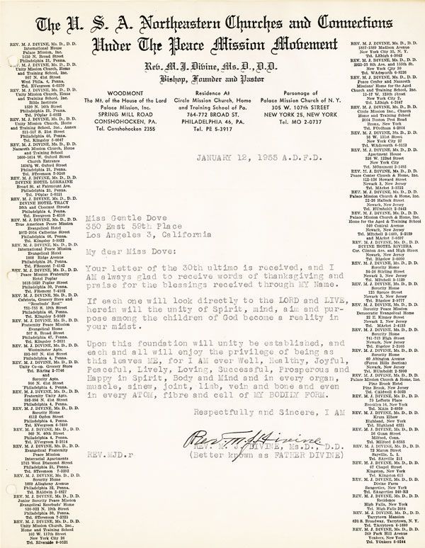 N.p.: S.i., 1955. Original color photograph, measuring 11.5cm x 16cm, housed in an off-white unprinted card presentation folder with typed letter tipped onto facing page. Mild signs of handling to folder, else Fine. Letter on Divine's letterhead, dated January 12, 1955. shows two old folds smoothed out, with a clear example of Rev. Divine's signature above his typed name. Handsome, informal color portrait of Rev. Major Jealous Divine (better known as Father Divine to his followers), dressed in a suit and seated in an armchair holding a letter. The photograph is accompanied by a typed letter from Divine to one "Miss Gentle Dove," thanking her for her letter "of the 30th ultimo" (the letter in the photograph presumably displayed so the recipient would think it was her own). The Reverend goes on to say that he is "always glad to receive words of thanksgiving and praise for the blessings received through MY name," concluding that he is "ever Well, Healthy, Joyful, Peaceful, Lively, Loving, Successful, Prosperous and Happy in Spirit, Body and Mind and in every organ, muscle, sinew, joint, limb, vein and bone and even in every ATOM, fibre and cell of MY BODILY FORM.