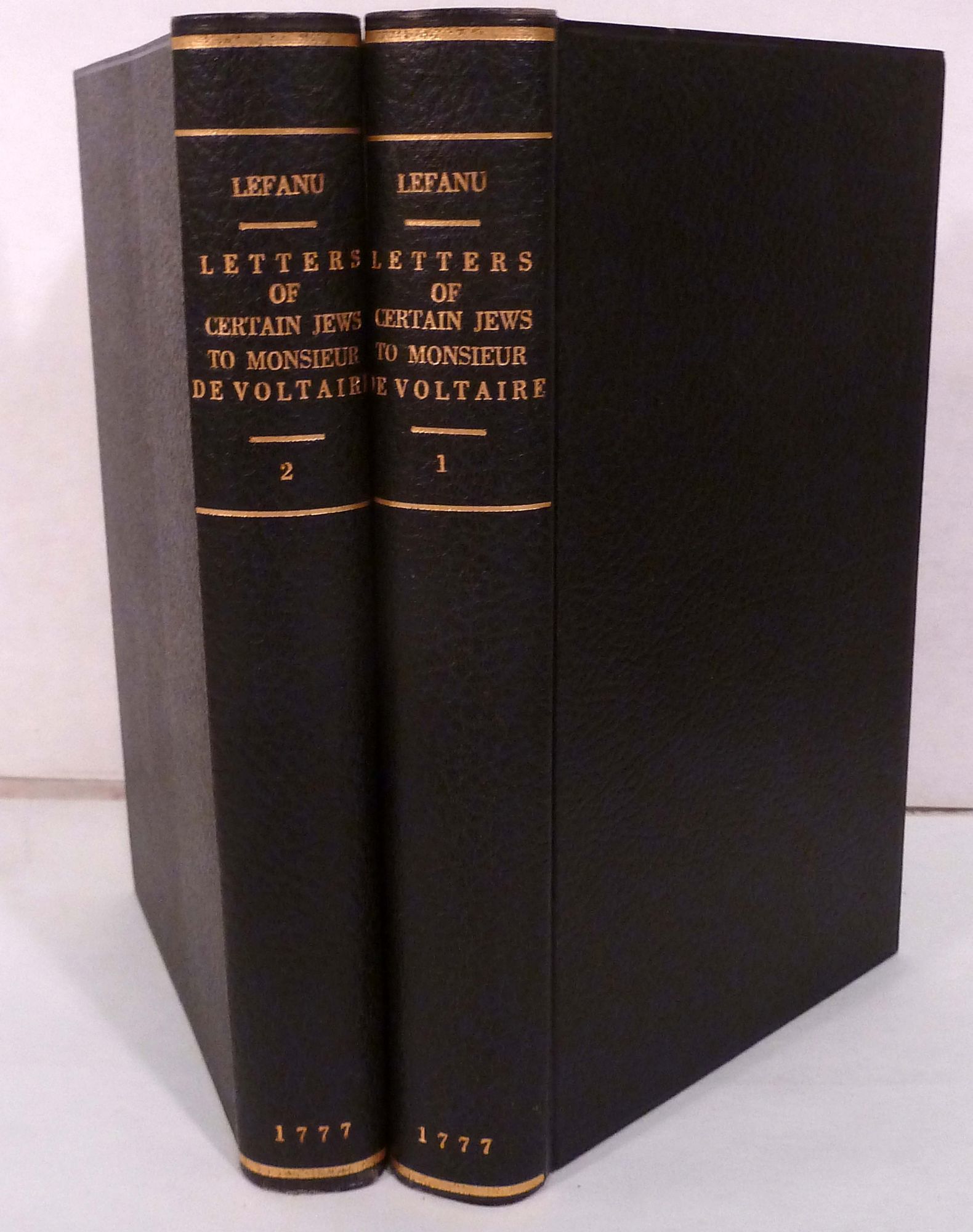 Dublin: William Watson, 1777. First edition. Hardcover. Modern black leatherette, spines printed in gilt. Near fine. 2 vols. 445, 428 pages. 21 x 14 cm. The controversy of Voltaire's anti-Semitism has been long disputed. He was at war with both Judaism and Christianity. He wanted to purge all men, of whatever persuasion, from these superstitions in order to make them enlightened. He ridiculed each of the major religions, but he was meanest to the Jews: ''You have surpassed all nations in impertinent fables, in bad conduct and in barbarism." Jacobins such as Jean Francois Rewbell in the 1790's and the socialist Pierre Proudhon in the next generation are among the many figures, especially of the left, who justified their arguments against the Jews by quoting Voltaire. Scattered toning, mostly in first and last leaves.