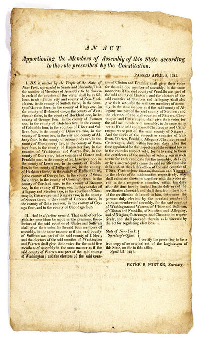 1815. [Albany]: April 8, 1815. 13" x 8" broadside. [Albany]: April 8, 1815. 13" x 8" broadside. Rare 1815 New York Broadside Concerning Representation in the State Assembly [Broadside]. [New York]. An Act Apportioning the Members of Assembly of this State According to the Rule Prescribed by the Constitution. [Albany]: April 8, 1815. 13" x 8" broadside. Lightly browned, light foxing and a few faint dampstains, fold lines, some edgewear, a few short tears along fold lines, annotations to verso. $450. * Reflecting the growth of New York's population, this act increased the number of assemblymen from 112 to 126. Annotations on our copy show that it was sent to the clerk of the town of Lewiston. No copies listed on OCLC.
