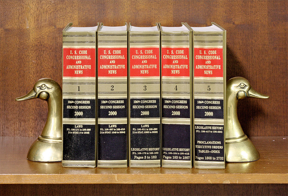 2000. United States Code Congressional And Administrative News. 2000 Part 1 to Part 5, in 5 books. St. Paul, MN: Thomson West. Publsher's cloth. Ex-library without any stamps or marks, very good to excellent condition. Special $100. * Contains the full text of new federal laws, Congressional Committee Reports that detail histories of the laws, signing statements, Presidential Proclamations, and Executive Orders. Arranged in chronological order, provides tables, including classifications to the U.S.C. and U.S.C.A. and the sections amended, repealed or otherwise affected and a cumulative index. The Public Law section of U.S.C.C.A.N. is organized by public law number. Bill numbers, dates of passage and titles appear before the actual text of the public law. If a legislative history of the act is included in another section of U.S.C.C.A.N., a reference to the page number will be provided under the title of the act.. The public law itself is then printed just as it appears in the Statues At Large. Cites to United States Code titles and section numbers are printed in the margins next to the relevant public law paragraphs. The Statutes at Large citation is printed across the bottom of the U.S.C.C.A.N. page. On the last page of the public law, a brief legislative history bibliography is provided if that public law is deemed significant. The brief legislative history bibliography provides cites to report numbers, Congressional Record volume numbers and years, and Senate and House passage dates.
