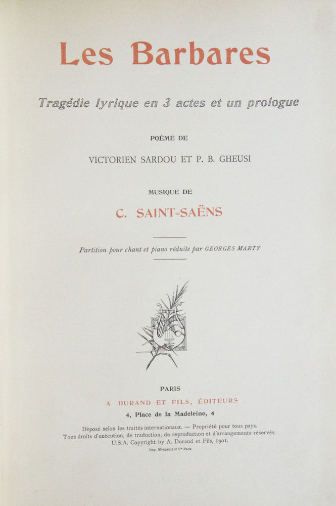 Les Barbares Tragédie lyrique en 3 actes et un prologue Poème de Victorien Sardou et P.B. Gheusi ... Partition pour chant et piano réduite par Georges Marty. [Piano-vocal score]