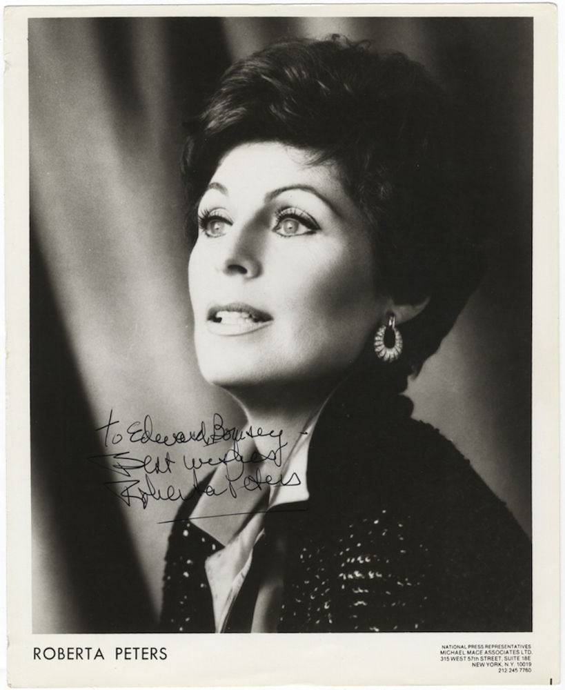 Slightly worn. Roberta Peters made her début at the Metropolitan Opera "in 1950 as Zerlina, a last-minute replacement for Nadine Conner; her official début was to have been as the Queen of Night, two months later. By her 25th anniversary with the company she had given 303 performances of 20 roles in 19 operas, notably Gilda, Despina, Norma, Rosina, Oscar, Zerbinetta and Lucia. Later she attempted to broaden her repertory in lyric soprano roles, playing Violetta, Mimì and Massenet’s Manon outside New York and performing in musical comedy. She performed at Covent Garden (The Bohemian Girl under Beecham, 1951), in Salzburg (Die Zauberflöte, 1963), Vienna (1963), Munich (1964) and Berlin (1971), and with the Kirov and Bol′shoy companies (1972). A singer of considerable charm and flute-like accuracy, Peters maintained the Pons and Galli-Curci tradition of coloratura singing at a time when the more dramatic attitudes of Callas and, later, Sutherland were in vogue. She recorded several of her most successful roles, including Zerbinetta and Rosina with Leinsdorf and the Queen of Night with Böhm." Martin Bernheimer in Grove Music Online.