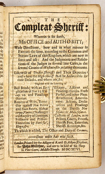 1696. London, 1696. First edition.. London, 1696. First edition. One of the Best Manuals of Its Kind [Sheriffs]. [Great Britain]. The Compleat Sheriff: Wherein is Set Forth, His Office and Authority; With Directions, How and in What Manner to Execute the Same, According to the Common and Statute Laws of This Kingdom, Which are Now in Force and Use: And the Judgments and Resolutions of the Judges in Divers Late Cases, In the Several Courts of Westminster, Relating Thereunto. Likewise of Under-Sheriffs and Their Deputies; And Where the High-Sheriff Shall be Answerable for Their Defaults, And Where Not, &c. Together with the Learning of Bail Bonds; With an Explication of Stat. 23 H.6. Cap. 10. And Pleadings Thereon. Retorns of Writs, Remedies Against Non Retorn and Faux Retorn, Habeas Corpus, Venires, Challenges and Enquiry of Damages. Prisoners and Prisons. Execution by Fieri Fac', Elegit, &c. Escapes, Actions and Pleadings Therein. Fresh Pursuit, And Other Pleas. Attachment, Americament: Actions, Declarations and Pleadings on the Sheriffs Non-Fesance or Male-Fesance. Customs of London, As to Prisons, Courts, Process, Sheriffs Fees, Extortion, Sheriffs Accompts, &c. To Which is Added, The Office and Duty of Coroners. London: Printed by the Assigns of R. and E: Atkyns, Esquires; For John Walthoe, 1696. [xxiv], 443, [21] pp. With preliminary advertisement leaf. Octavo (7-1/2" x 4-1/2"). Contemporary calf, blind rules to board, blind fillets along joints, raised bands and later lettering piece to spine, early repair to head of spine. Light rubbing and a few faint stains to boards, moderate rubbing to extremities, tiny chip to foot of spine, corners bumped and somewhat worn, hinges cracked. Moderate toning to text, faint dampstaining in places, Signature G (pp. 81-95) partially detached with some wear along fore-edge, horizontal tear through rear free endpaper. Early signatures to preliminaries (Gerrit van Schak, 1756), early annotations front pastedown and some leaves, additional annotations in same hand on small slips of paper pasted to edges of a few other leaves. An appealing copy. $750. * First edition. One of the most thorough books of its kind, the aptly-titled Compleat Sheriff is notably descriptive. It also includes citations of legal cases, bibliographical references, chapters on juries and habeas corpus and a detailed discussion of the law of escapes. A useful and long-lived wor.