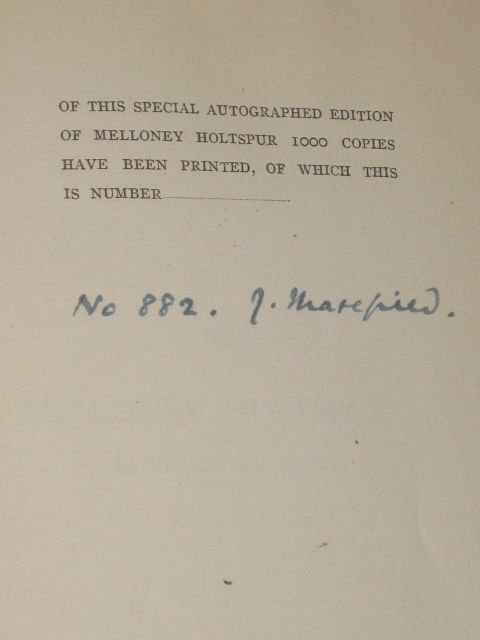 New York: The Macmillan Company, 1922. LIMITED EDITION. Hard Cover with Dust Jacket. Very Good+. Octavo. LIMITED EDITION OF 1000 NUMBERED AND SIGNED COPIES THIS IS No.882. SIGNED BY JOHN MASEFIELD ON COLOPHON without personalization. 151pp., bound in 1/4 black cloth over gray paper covered boards with paper label lettered in black, spine letteing gilt. Minimal soil covers, wear spine tip. A nice copy.