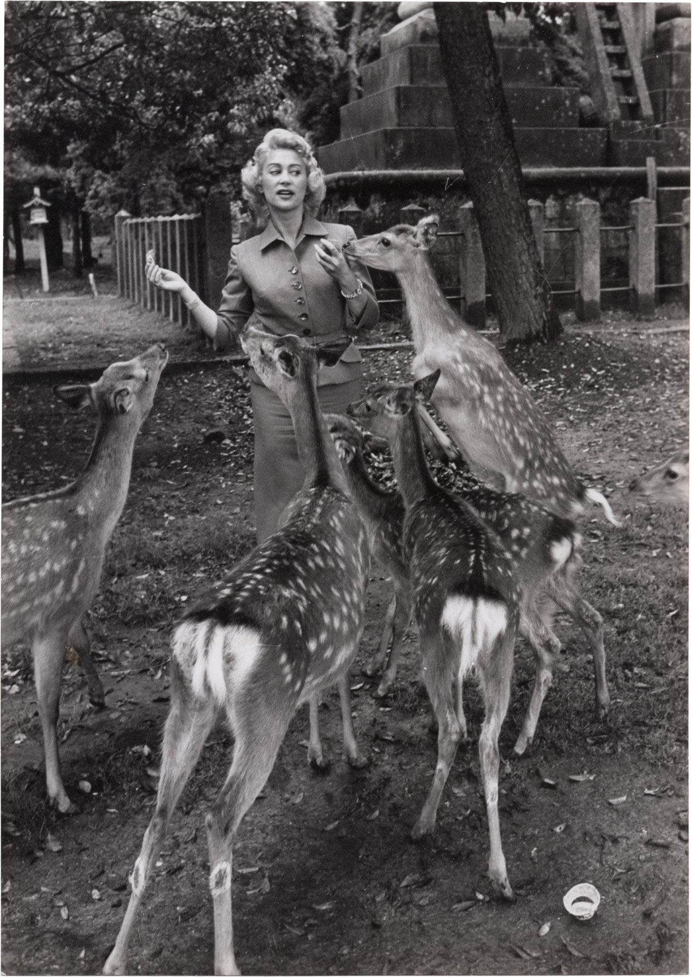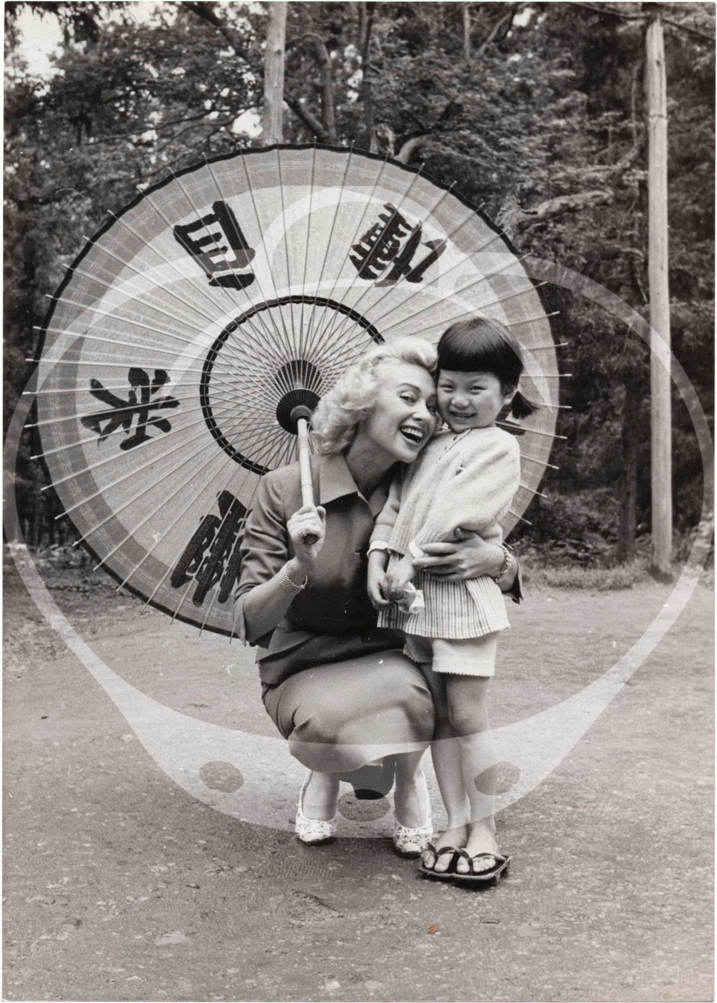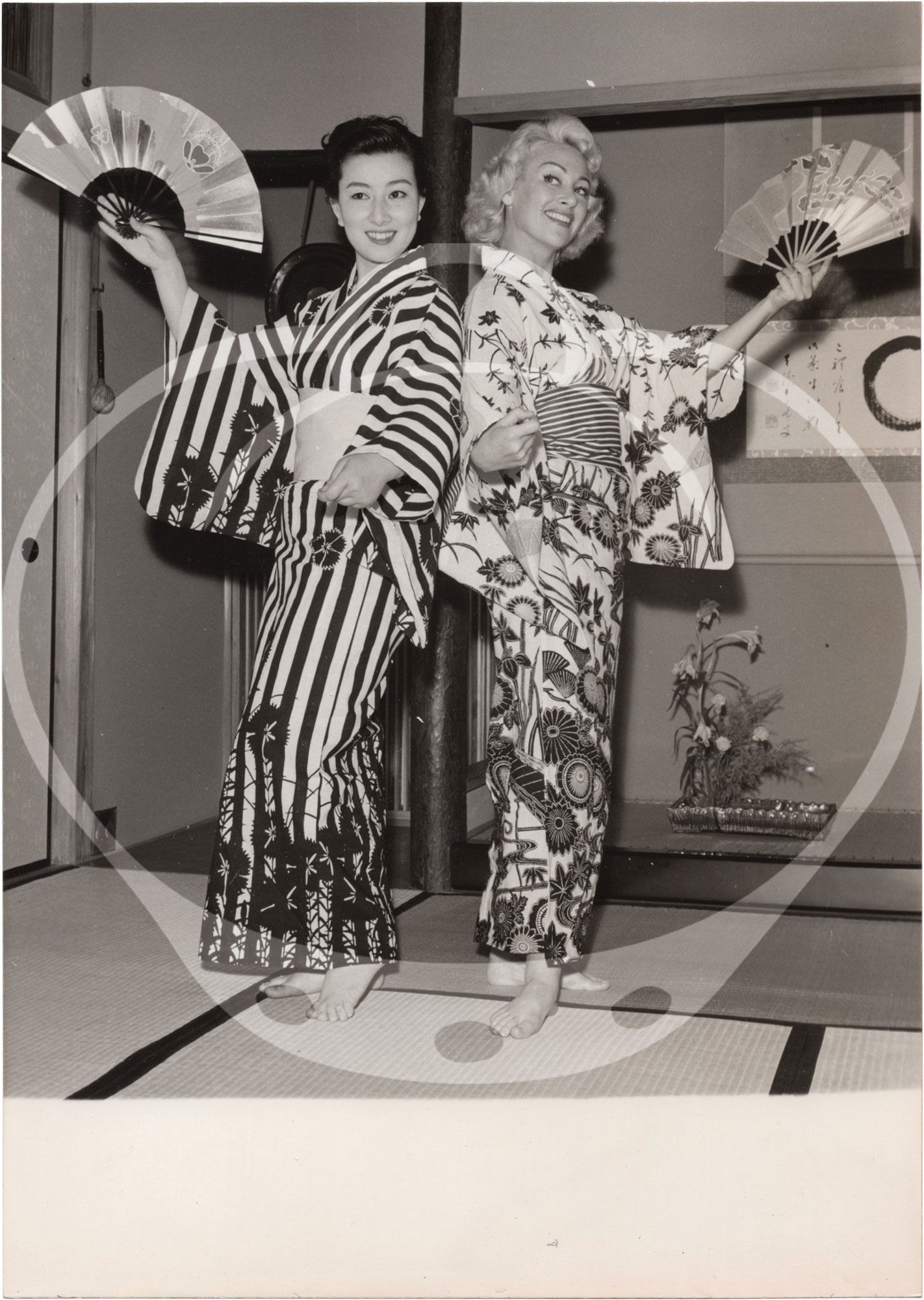 N.p.: N.p., 1950. Collection of 3 vintage black-and-white photographs of actress Martine Carol, seen here traveling in Asia. All photos, shot by an unknown photographer, feature the bubbly Parisian galavanting with Geishas enjoying Asian culture.