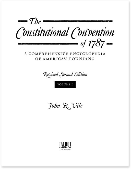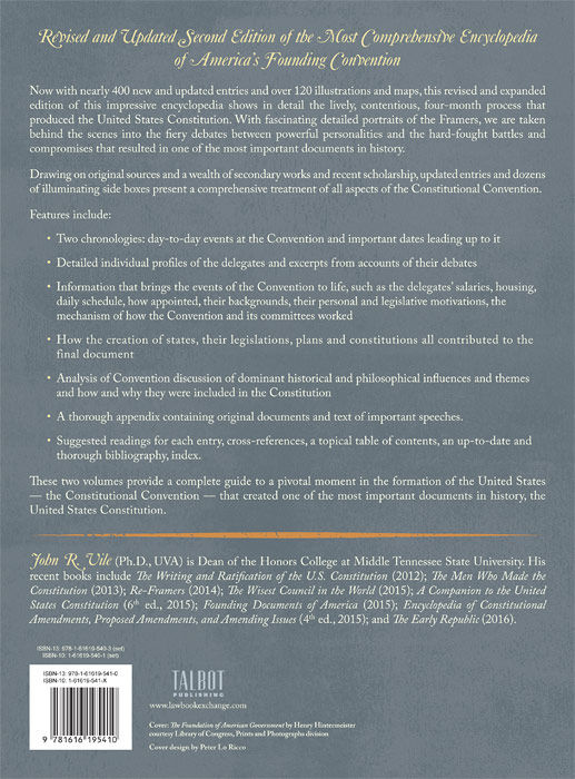 2016. ISBN-13: 9781616195403. ISBN-10: 1616195401. Vile, John R. The Constitutional Convention of 1787: A Comprehensive Encyclopedia of America's Founding Revised Second Edition. 2 vols. lxxv, 1157 pp. Clark, New Jersey: Talbot Publishing (an imprint of The Lawbook Exchange, Ltd.), 2016. ISBN-13: 9781616195403. ISBN-10: 1616195401. Hardcover. New. $225. * Now with nearly 400 new and updated entries and over 120 illustrations and maps, this revised and expanded edition of this impressive encyclopedia shows in detail the lively, contentious, four-month process that produced the United States Constitution. With fascinating detailed portraits of the Framers, we are taken behind the scenes into the fiery debates between powerful personalities and the hard-fought battles and compromises that resulted in one of the most important documents in history. Drawing on original sources and a wealth of secondary works and recent scholarship, updated entries and dozens of illuminating side boxes present a comprehensive treatment of all aspects of the Constitutional Convention. Features include: - Two chronologies: day-to-day events at the Convention and important dates leading up to it - Detailed individual profiles of the delegates and excerpts from accounts of their debates - Information that brings the events of the Convention to life such as the delegates' salaries, housing, daily schedule, how appointed, their backgrounds, their personal and legislative motivations, the mechanism of how the Convention and its committees worked - How the creation of states, their legislations, plans and constitutions all contributed to the final document - Analysis of Convention discussion of dominant historical and philosophical influences and themes and how and why they were included in the Constitution - A thorough appendix containing original documents and text of important speeches. - Suggested readings for each entry, cross-references, a topical table of contents, an up-to-date and thorough bibliography, index. These two volumes provide a complete guide to a pivotal moment in the formation of the United States -- the Constitutional Convention -- that created one of the most important documents in history, the United States Constitution. JOHN R. VILE (Ph.D., UVA) is Dean of the Honors College at Middle Tennessee State University. He is the author of numerous books on the United Sta.