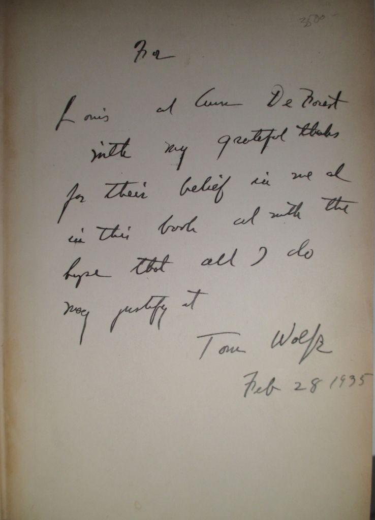 Presentation copy "For Louis and Anne De Forest with my grateful thanks for their belief in me & in this book & with the hope that all I do may justify it/ Tom Wolfe/ Feb. 28, 1935.