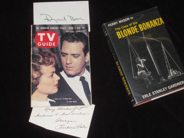 New York: William Morrow, 1962. First Edition. Hard Cover with Dust Jacket. Fine/Near Fine. A fine copy in a nearly fine dust jacket. Together with TV Guide for Feb. 21 - 27, 1959, with Raymond Burr and Barbara Hale on the front wrapper; together with clipped signatures of the two stars of the Perry Mason series.
