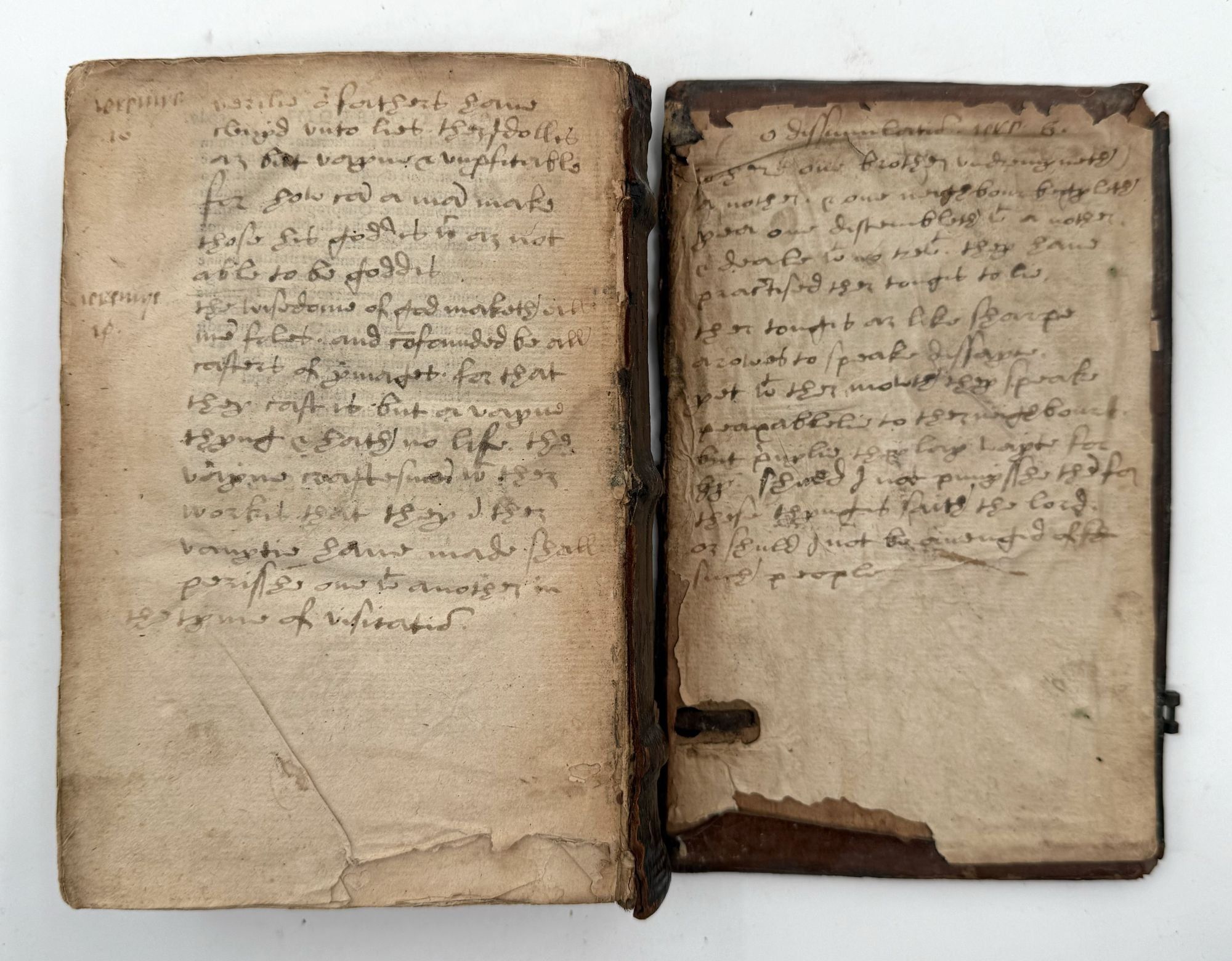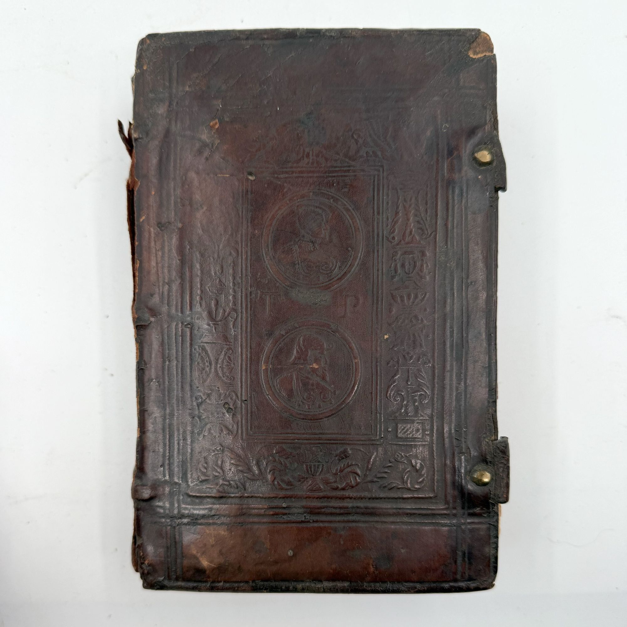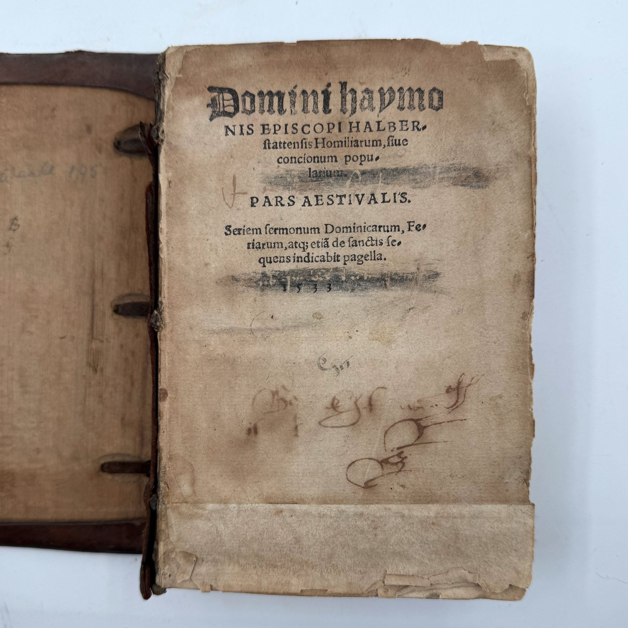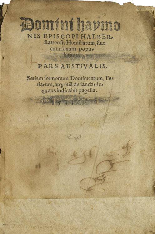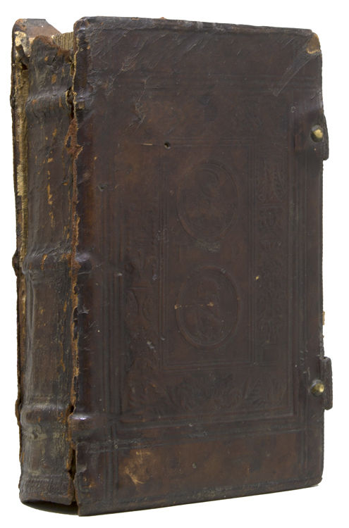 [Paris: Antoine Bonnmère?], 1533. xi [i.e. viii], 9-234 [i.e. 232], ccxxxv-ccxlv [i.e. ccxliii, 1] leaves; A-Z8, Aa-Gg8, Hh4. 1 vols. 8vo. Contemporary blind-stamped calf over wooden boards, covers with blind-ruled borders and central ornamental frame enclosing two embossed medallion portraits separated by letters “T P”; remains of brass catches and clasps perished; covers detached and spine defective. Text somewhat stained and soiled, first leaf A1 detached and stained, remargined at foot; rear endsheets filled with intriguing notes in English in a 16th-century hand; occasional early pen stars and marginalia in Latin in text. xi [i.e. viii], 9-234 [i.e. 232], ccxxxv-ccxlv [i.e. ccxliii, 1] leaves; A-Z8, Aa-Gg8, Hh4. 1 vols. 8vo. A rare printing of these Sermons on religious holidays attributed to Benedictine monk and prolific author Haymon of Halberstadt (d. 843), who was appointed Bishop of Halberstadt in 840. The BnF notes that Haymon was closely associated with the École d'Auxerre and the monastery of Saint-Germain. OCLC locates three copies -- only one in American institutions. Moreau, Inventaire IV, 560; OCLC: 920023692 (3 copies: BnF, Salamanca, and HRC)