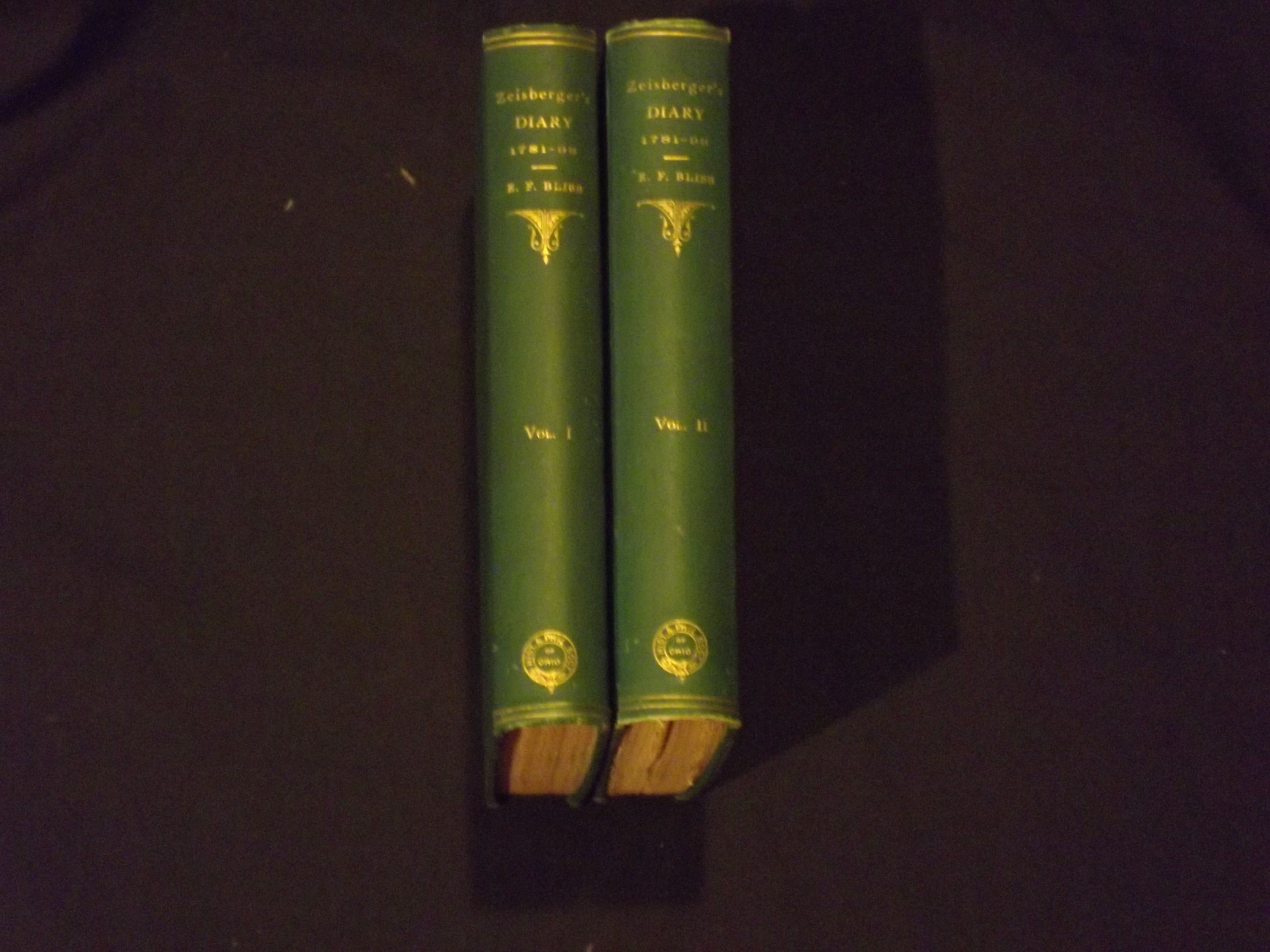 2 volumes. (8vo) original green cloth, spines lettered in gilt, 464, 535 pp. Light wear, bookplates on pastedowns, normal aging; otherwise very good. Translated from the original German manuscript by Eugene F. Bliss. The author David Zeisberger (1721-1808) was born in Moravia and immigrated to British North America in the late 1730s. He joined the Church of the Unity of the Brethren, known as the Moravian Church. He settled near Bethlehem, Pennsylvania, and became a missionary to various Native American groups in Pennsylvania, New York and Ohio. As a missionary, Zeisberger emphasized how Christianity could be beneficial to the natives. However, his work often led to the end of the traditional ways of life of the American Indian converts. He had considerable success with the Indians in Eastern Ohio, but many Native Americans found the necessary changes to their lifestyle unacceptable. Zeisberger was someone who enjoyed the outdoors and sports, but more importantly he developed a good command of Native American languages. These two volumes chronicle Zeisberger's life and travels among the Indians. The diary covers the period between 1781-1798, and he discusses many tribes, including the Delawares, Iroquois, Shawanese, Chippewas, and Potawatomies. He describes travels to the Western United States (what was western at the time) a journey to Detroit, and another journey to the Huron River. Howes Z5. Ohio history central website.
