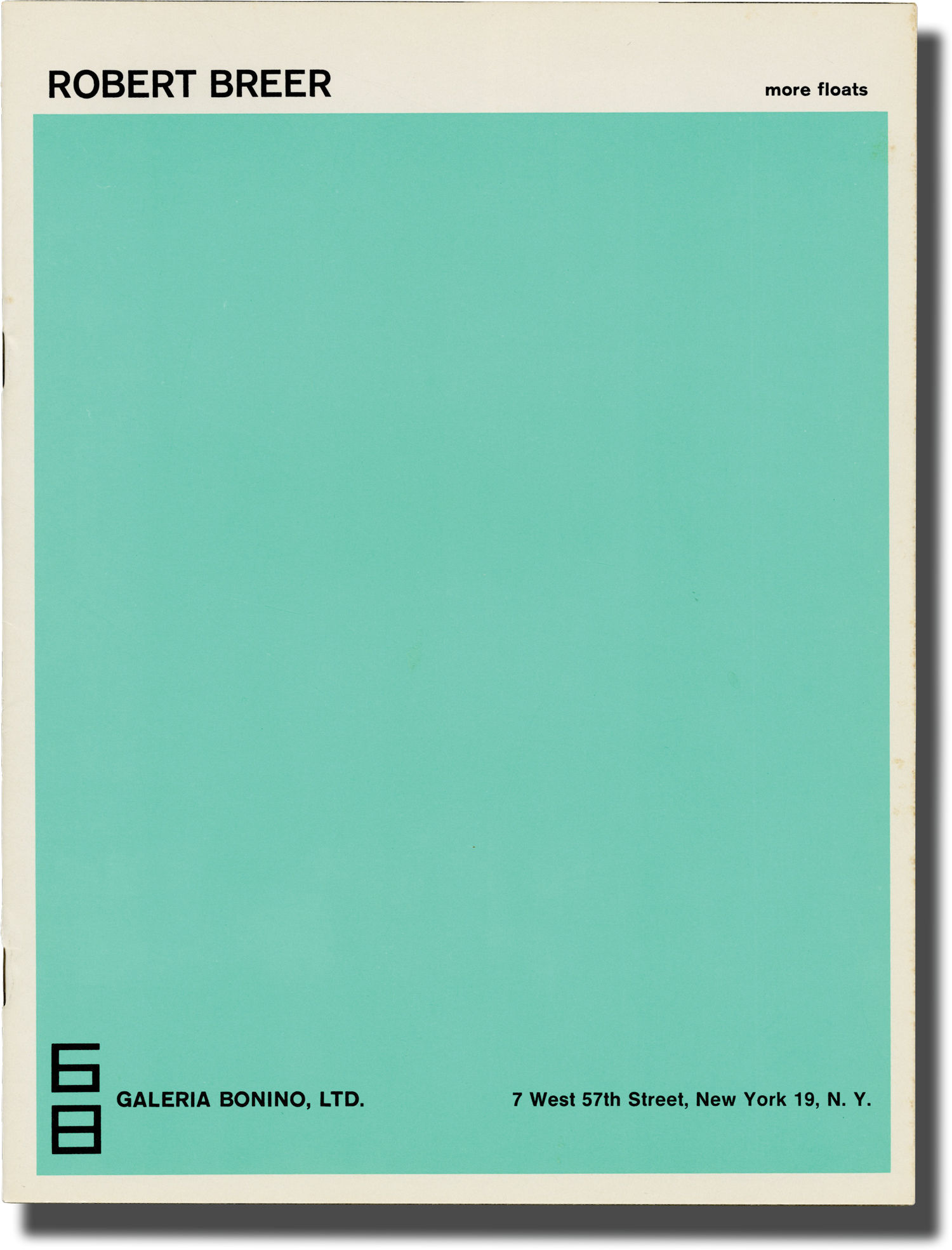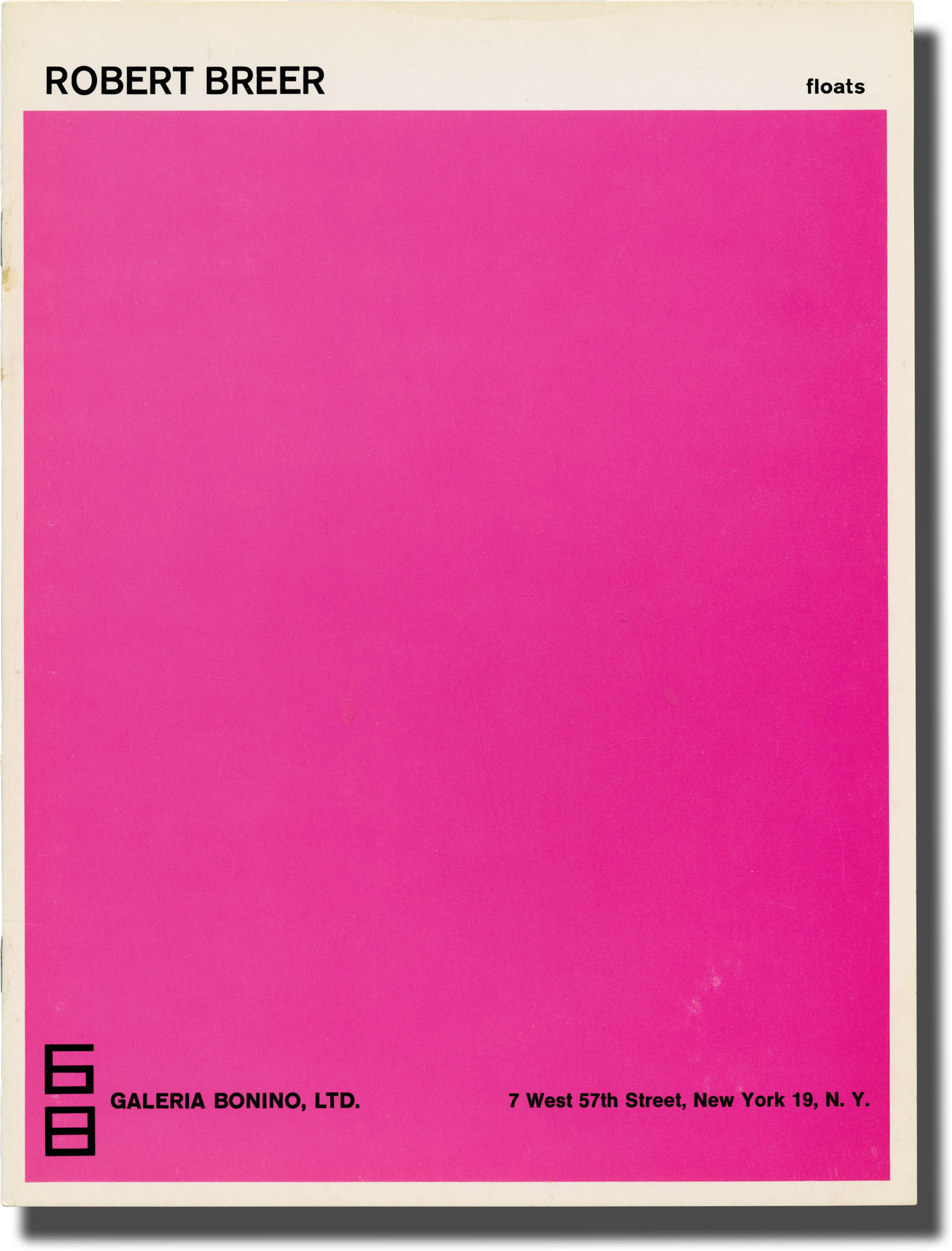 The other three catalogs deal with exhibitions of Breer's "floats," three-dimensional geometric shapes that the director would construct, then roll down a street as one would a float in a parade—though typically Breer chose rural roads as a means of offsetting the sheer modernity of his objects. Each catalog ends with a list of Breer's exhibitions to date. These three exhibitions, titled "Floats," "More Floats," and "93 Floats," were held at the gallery in 1966, 1967, and 1970, and are labeled Exhibition Nos. 18, 29, and 44, respectively.