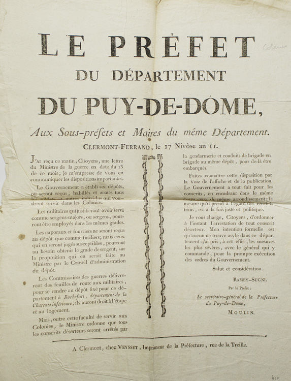 Clermont: Chez Veysset, imprimeur de la Prefecture, 1794. 1 vols. ca. 15 x 20 inches. Broadside. Folded, some marginal discoloration, loss in blank area along fold in upper margin, else very good. 1 vols. ca. 15 x 20 inches. Concerning the government offer to arm and dress soldiers and other individuals who would like to serve in the Colonies and requesting that the people not to protect deserters. Issued under the name of Ramey-Sugni for Moulin.