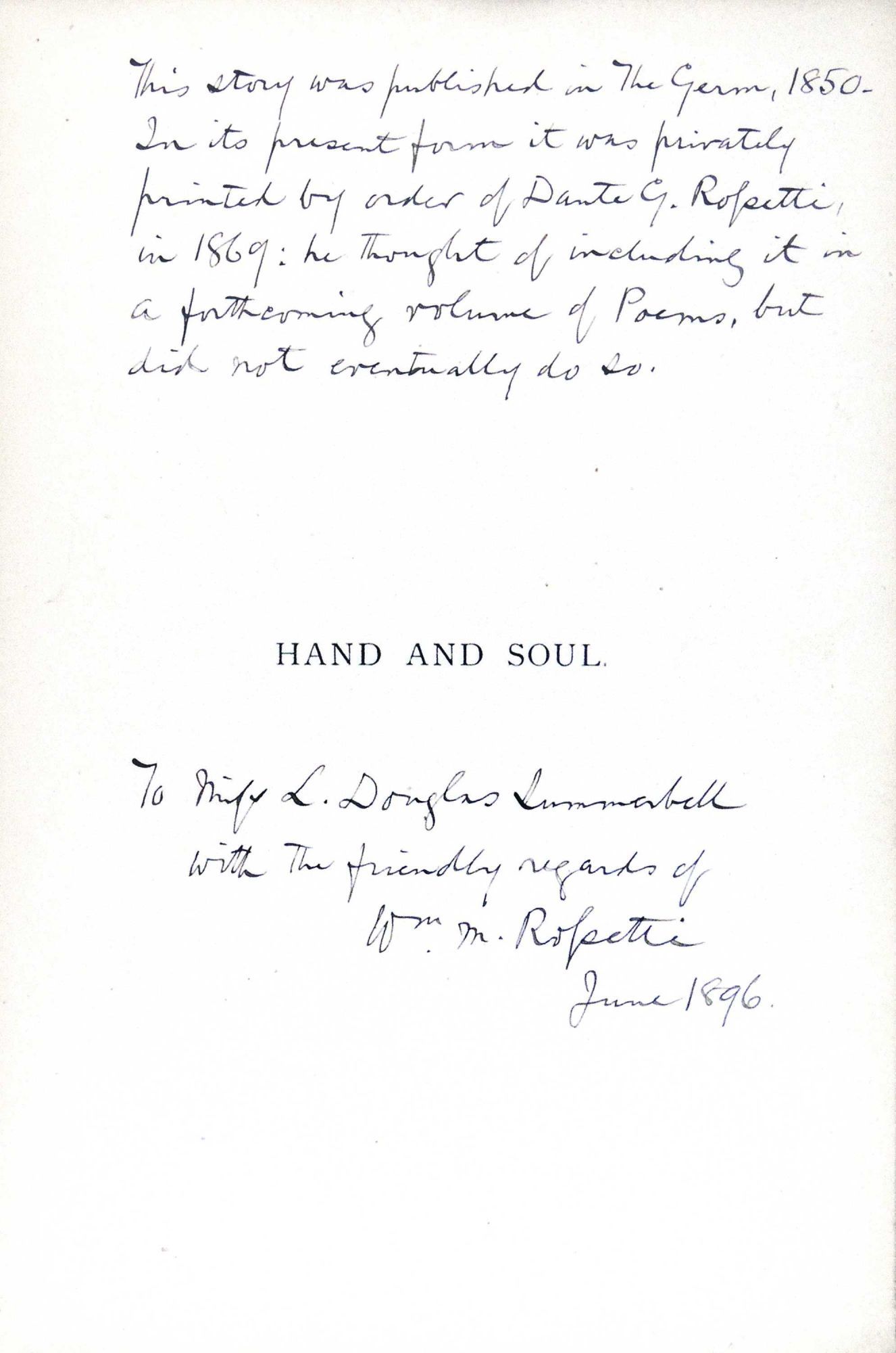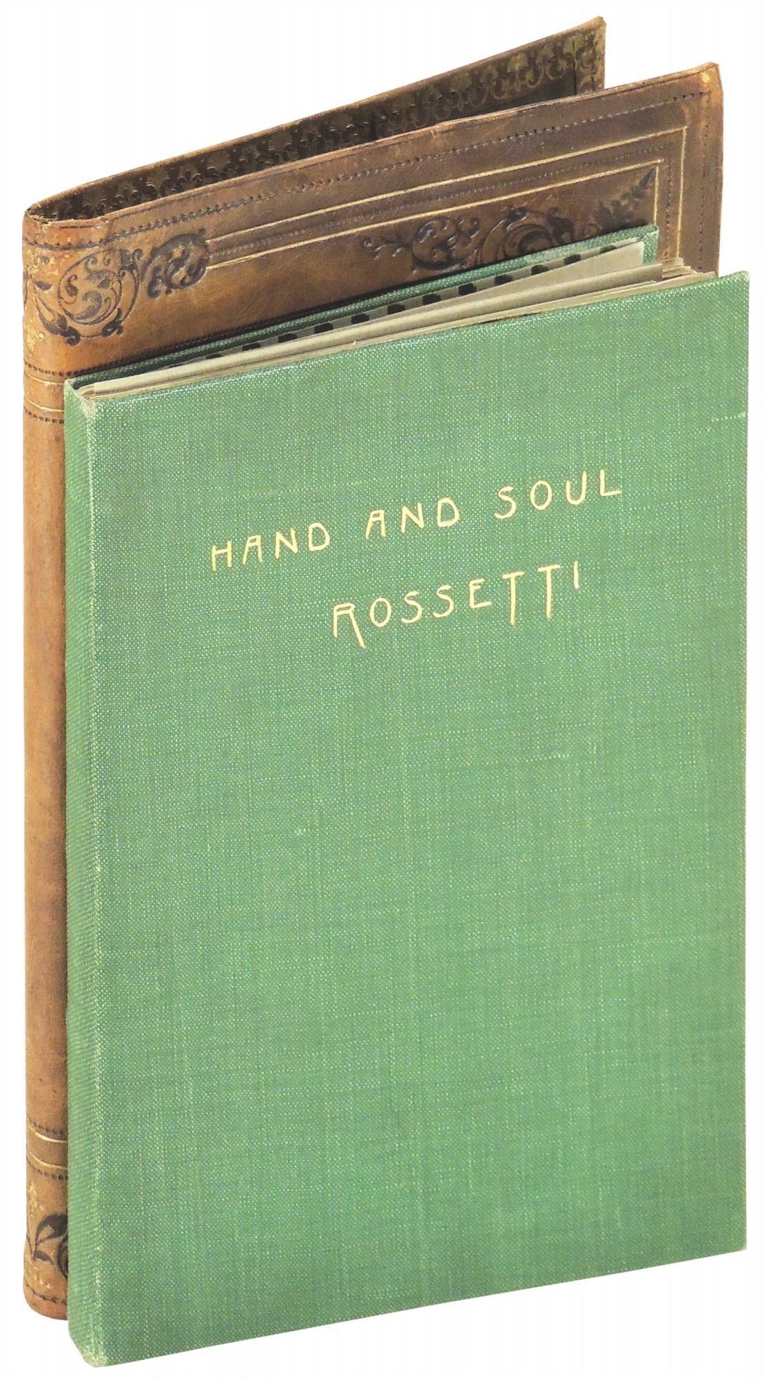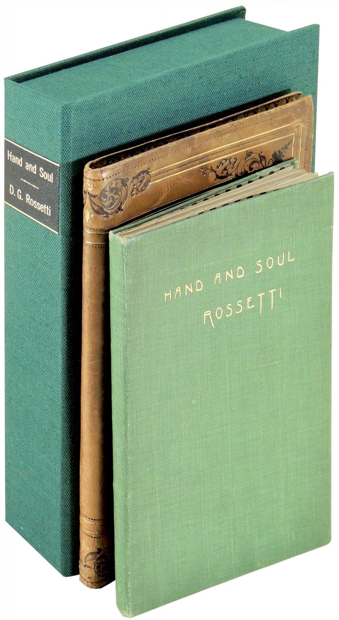 London: Stangeways and Walden, 1869. Near Fine. First edition. A unique and most interesting offering - a scarce privately printed book accompanied by only recently published handwritten letters from Rossetti's brother, William Michael (the texts of the letters were published for the first time in "Notes and Queries," Oxford University Press, in January 17, 2011). This is a privately printed edition of a story that had first appeared in The Germ in 1850. Dante Gabriel Rossetti originally intended to include this prose story in his volume of verse, but decided not to following the recovery of his poetical manuscript notebook from the grave of his wife, Elizabeth Siddal. This short story offers a manifesto for the Aesthetic and Decadent movements. It tells the tale of a fictional Renaissance poet who realizes that the artist's only duty is to express what is in his soul. This pamphlet is an offprint from the typesetting found in proofs produced between October 30 and November 25 1869. William Rossetti notes when his brother excluded the story from his published verse he had various copies of Hand and Soul done up in drab wrappers, and that he gave some away but never sold them. Both Thomas Wise and Charles Fairfax Murray state, without citing any authority, that one hundred copies were printed. About thirty can now be accounted for. All but a handful are in institutional collections, most deriving from a cache discovered by William after Dante Gabriel's death in 1882. William Michael Rossetti sent this copy to an admirer of his family, Louisa Douglas Summerbell. She was an artist and illuminator much influenced by the Pre-Raphaelites. Rossetti has inscribed the book "To Miss L. Douglas Summerbell with the friendly regards of Wm. Rossetti June 1896." Written above this in William's hand is a six-line explanation of the pamphlet's publishing history. Bound in are five important signed autograph letters, seventeen pages in all, from William Rossetti to Miss Summerbell, written between 1896 and 1906, in which he discusses at length the writings of Dante Gabriel, Christina and himself. In original buff printed wrappers that Summerbell had neatly sewn into limp green cloth along with the letters and laid into a beautiful 19th-century handmade leather case showing some rubbing. On the preliminary leaf of the cloth bound book is a note that it had passed to her friend, Ruth Johnston. From the celebrated poetry collection of Gerald N. Wachs and included in an exhibition of his collection at the Grolier Club in 1995. Pamphlet in very good collection bound into near fine cloth book. Housed in a green cloth covered clamshell box with black and gilt title label to spine.