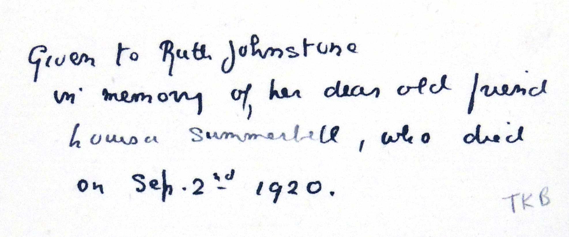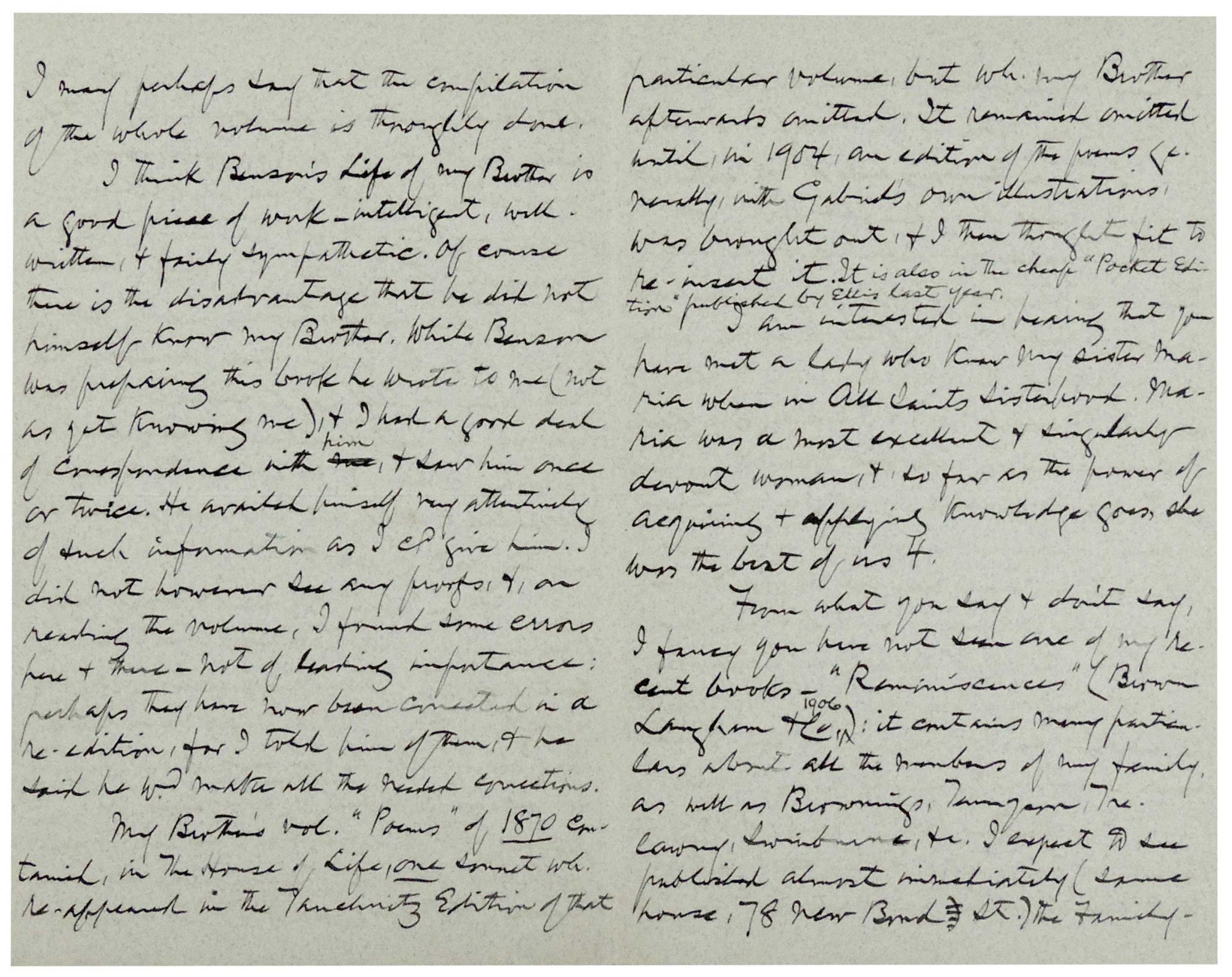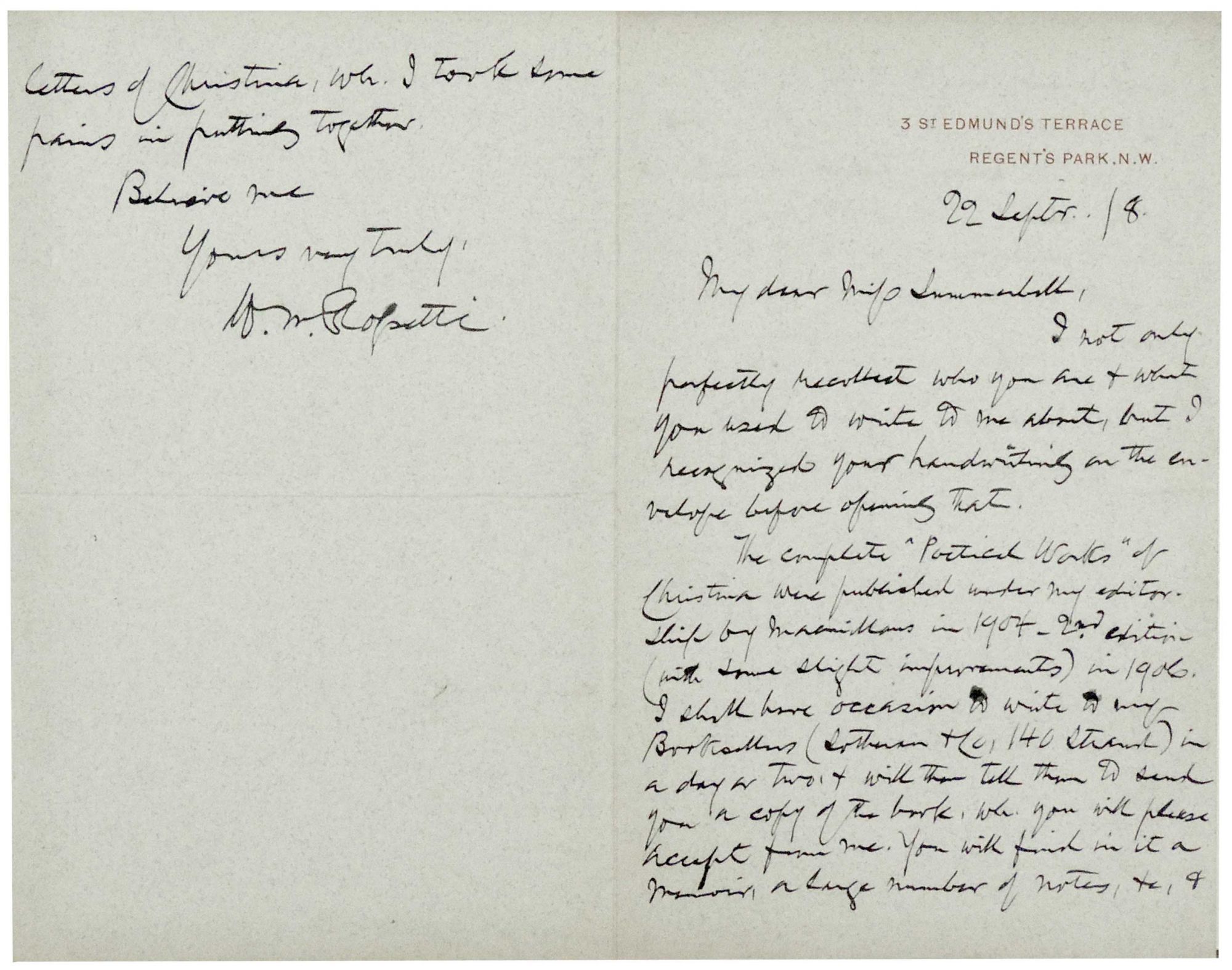 London: Stangeways and Walden, 1869. Near Fine. First edition. A unique and most interesting offering - a scarce privately printed book accompanied by only recently published handwritten letters from Rossetti's brother, William Michael (the texts of the letters were published for the first time in "Notes and Queries," Oxford University Press, in January 17, 2011). This is a privately printed edition of a story that had first appeared in The Germ in 1850. Dante Gabriel Rossetti originally intended to include this prose story in his volume of verse, but decided not to following the recovery of his poetical manuscript notebook from the grave of his wife, Elizabeth Siddal. This short story offers a manifesto for the Aesthetic and Decadent movements. It tells the tale of a fictional Renaissance poet who realizes that the artist's only duty is to express what is in his soul. This pamphlet is an offprint from the typesetting found in proofs produced between October 30 and November 25 1869. William Rossetti notes when his brother excluded the story from his published verse he had various copies of Hand and Soul done up in drab wrappers, and that he gave some away but never sold them. Both Thomas Wise and Charles Fairfax Murray state, without citing any authority, that one hundred copies were printed. About thirty can now be accounted for. All but a handful are in institutional collections, most deriving from a cache discovered by William after Dante Gabriel's death in 1882. William Michael Rossetti sent this copy to an admirer of his family, Louisa Douglas Summerbell. She was an artist and illuminator much influenced by the Pre-Raphaelites. Rossetti has inscribed the book "To Miss L. Douglas Summerbell with the friendly regards of Wm. Rossetti June 1896." Written above this in William's hand is a six-line explanation of the pamphlet's publishing history. Bound in are five important signed autograph letters, seventeen pages in all, from William Rossetti to Miss Summerbell, written between 1896 and 1906, in which he discusses at length the writings of Dante Gabriel, Christina and himself. In original buff printed wrappers that Summerbell had neatly sewn into limp green cloth along with the letters and laid into a beautiful 19th-century handmade leather case showing some rubbing. On the preliminary leaf of the cloth bound book is a note that it had passed to her friend, Ruth Johnston. From the celebrated poetry collection of Gerald N. Wachs and included in an exhibition of his collection at the Grolier Club in 1995. Pamphlet in very good collection bound into near fine cloth book. Housed in a green cloth covered clamshell box with black and gilt title label to spine.