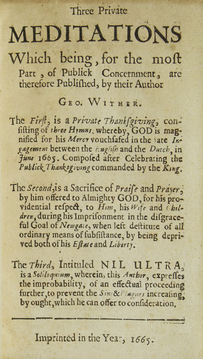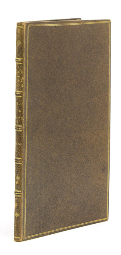 London: np, 1665. First edition. 48 pp. 8vo. Modern speckled calf by Riviere, gilt, a.e.g., trimmed close with occasional loss to headers. First edition. 48 pp. 8vo. These brief reflections in verse embody the ongoing concerns of Wither. The first rallies against the Second Anglo-Dutch War, the second hopes for the safety of his wife and children during his imprisonment, and the final piece is a meditation on the horror of the plague. ESTC: R12458; Wing W 3197; Wither to Prior 1073. Provenance: Fairfax of Cameron (bookplate); Robert S. Pirie (bookplate)