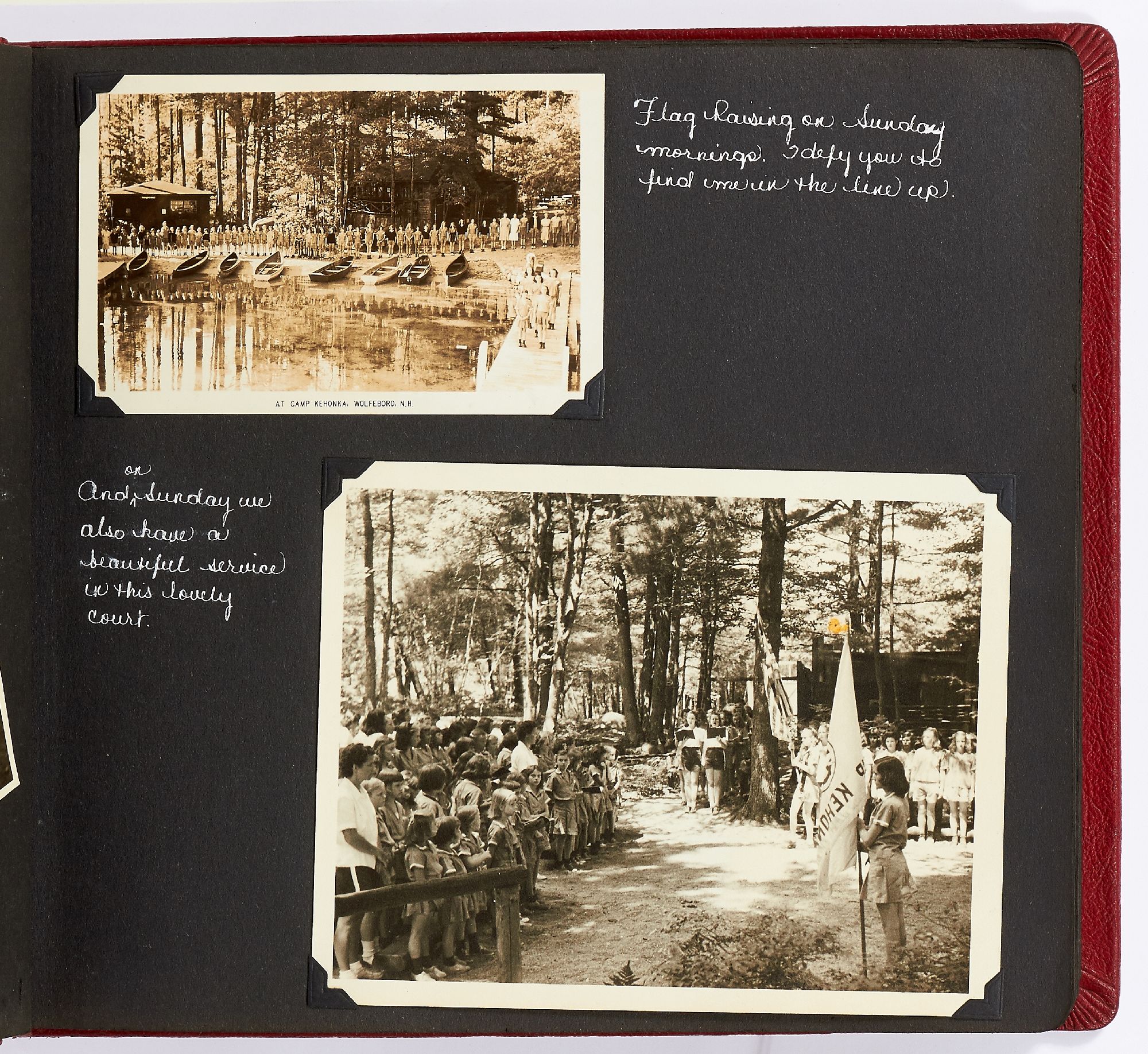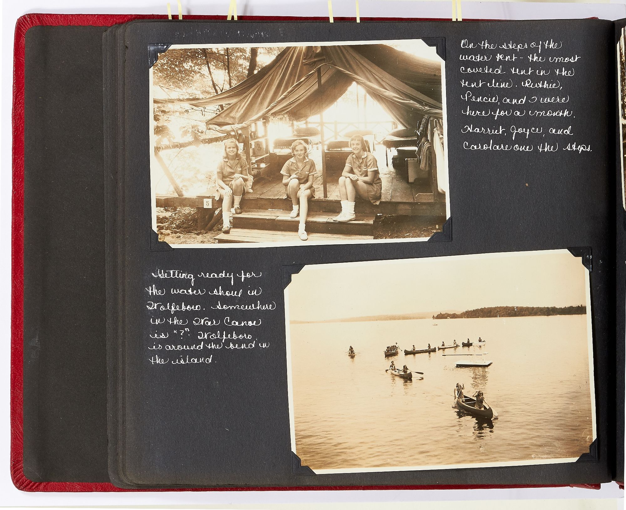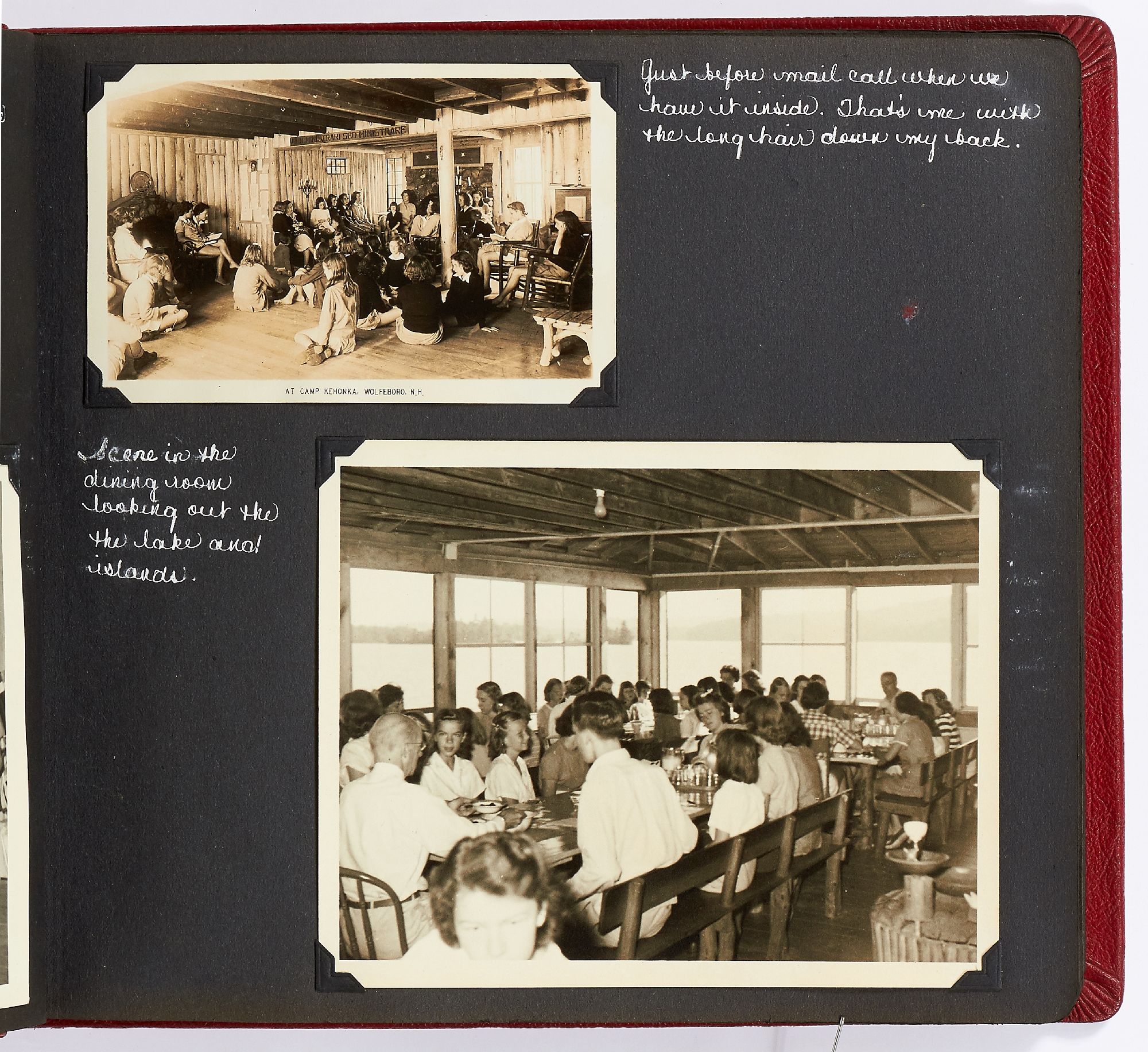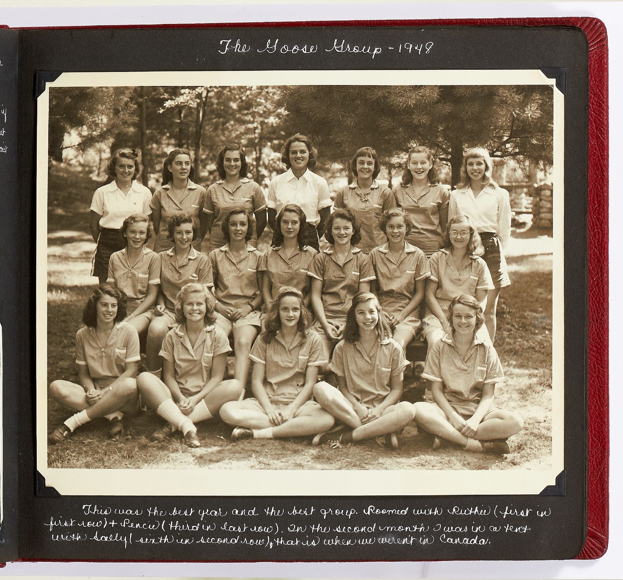 A photo album kept by a young woman who for multiple summers attended the Camp Kehonka, a private girl's camp in New Hampshire throughout the end of the 1940s. Many of the photos show professional group photos from each summer she spent at the camp. The photos are also heavily captioned and the album begins with “well, let’s start off with pictures of dear old Camp Kehonka and the shores of Winnipesaukee!” It’s followed by a group photo which reads, “I had graduated from being a Duckling (that picture is in the camp scrapbook) and now I was a Duck with Miss Ackley to watch over me. That’s Anne-Marie my tentmate smirking away over there on the left in the front. This isn’t all the Ducks – just my group.” She rose through the ranks of various waterfowl which also included the Goose Group, a group of older girls, in 1948. The group photo of the Goose Group reads, “this was the best year and the best group. Roomed with Ruthie (first in first row) and Pencie (third in last row). In the second month I was in a tent with Sally (sixth in second row), that is when we weren’t in Canada.”