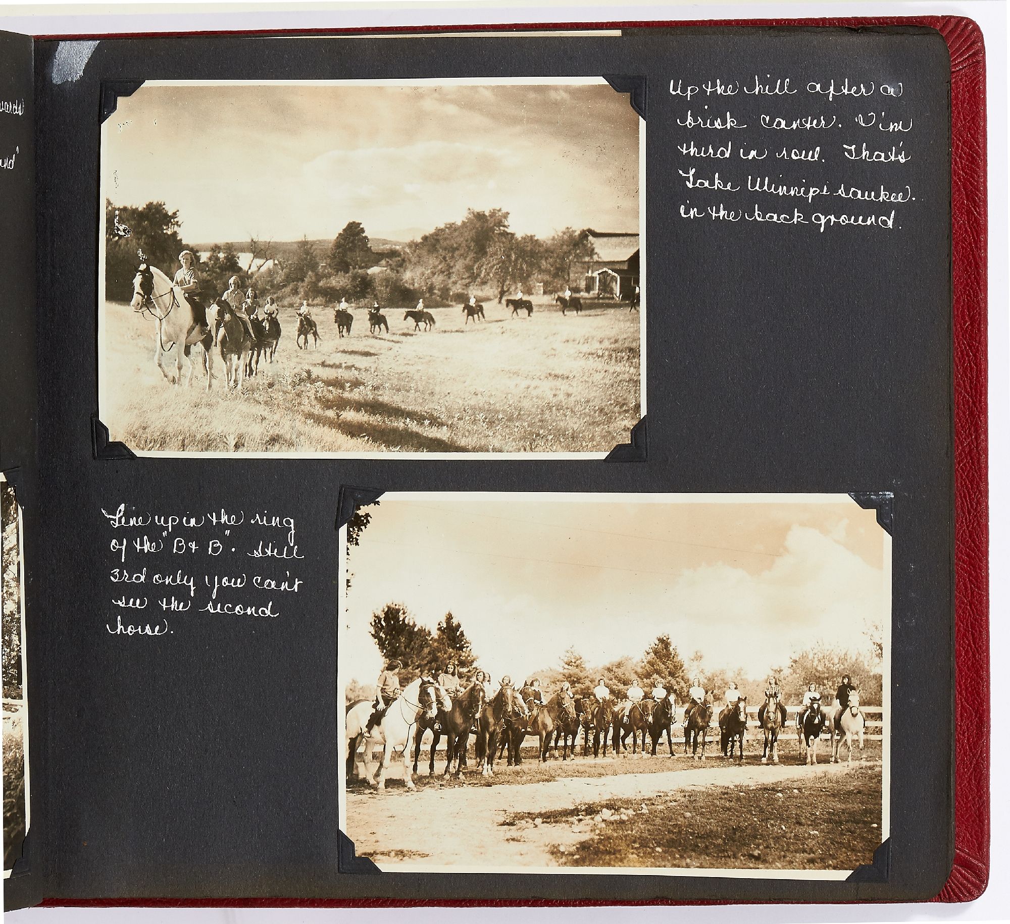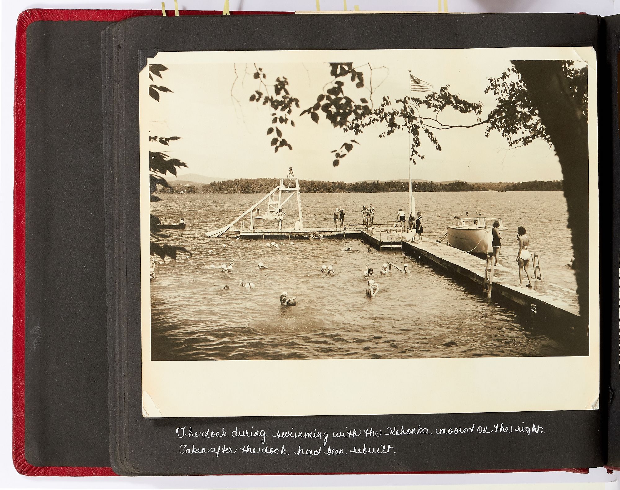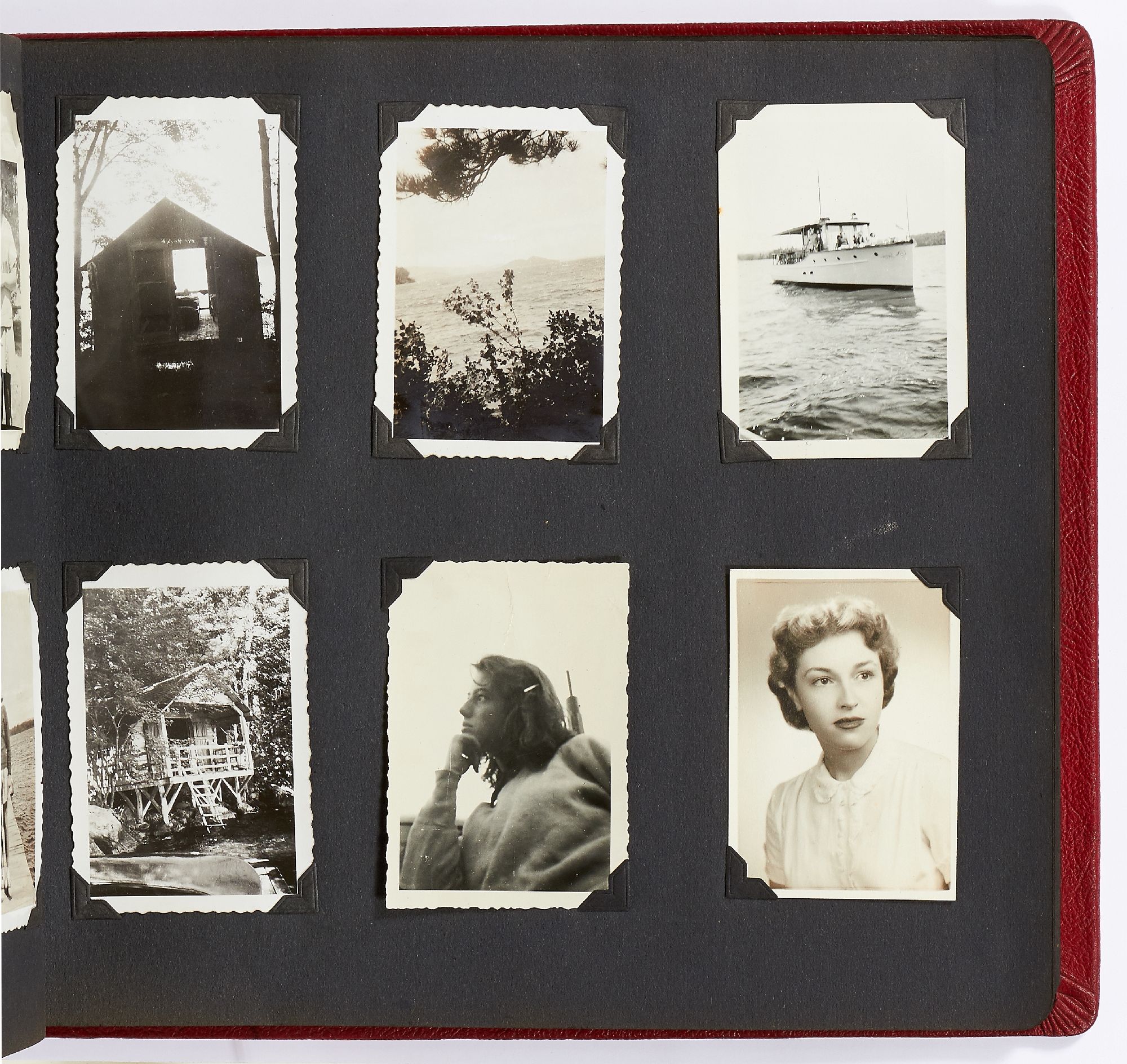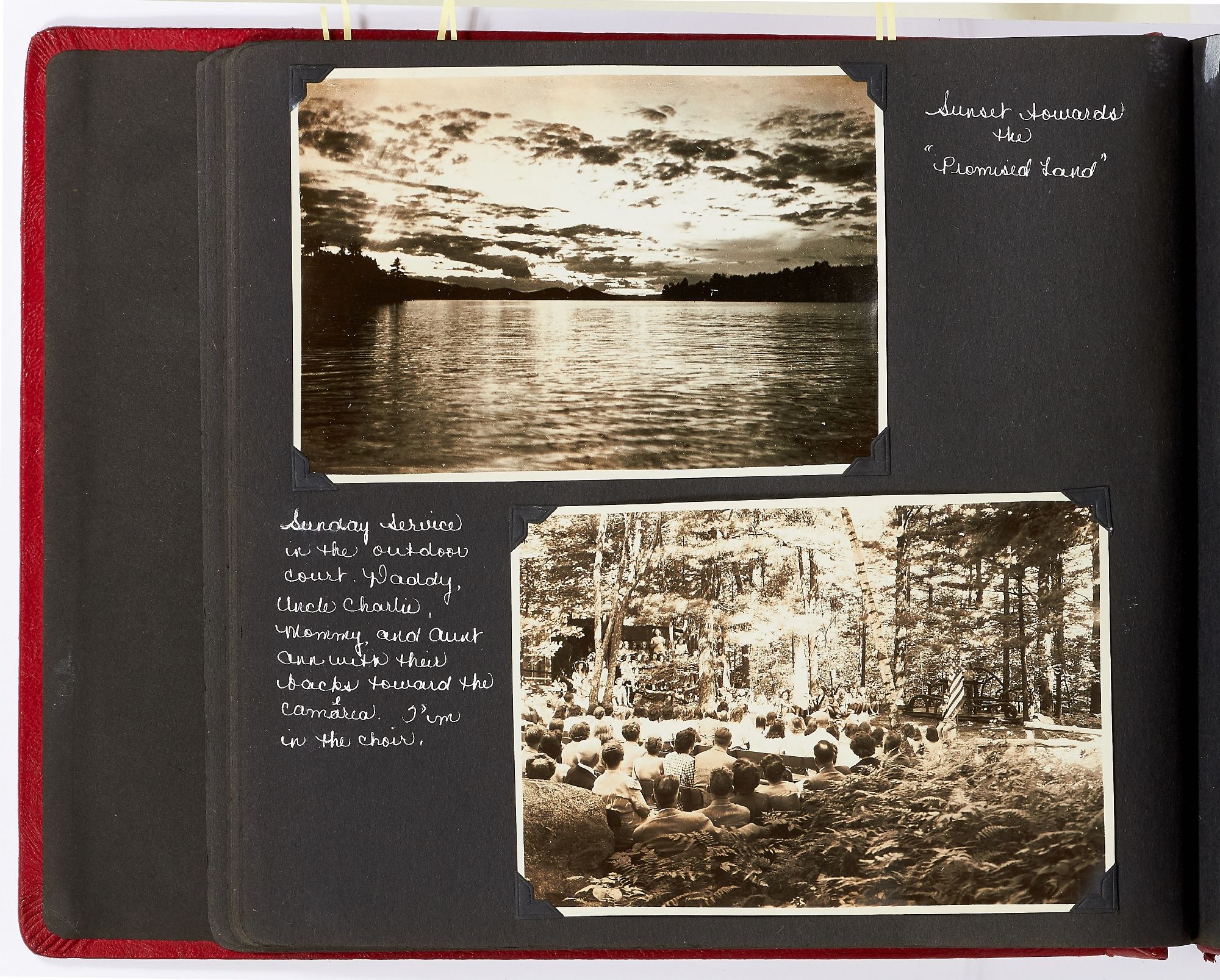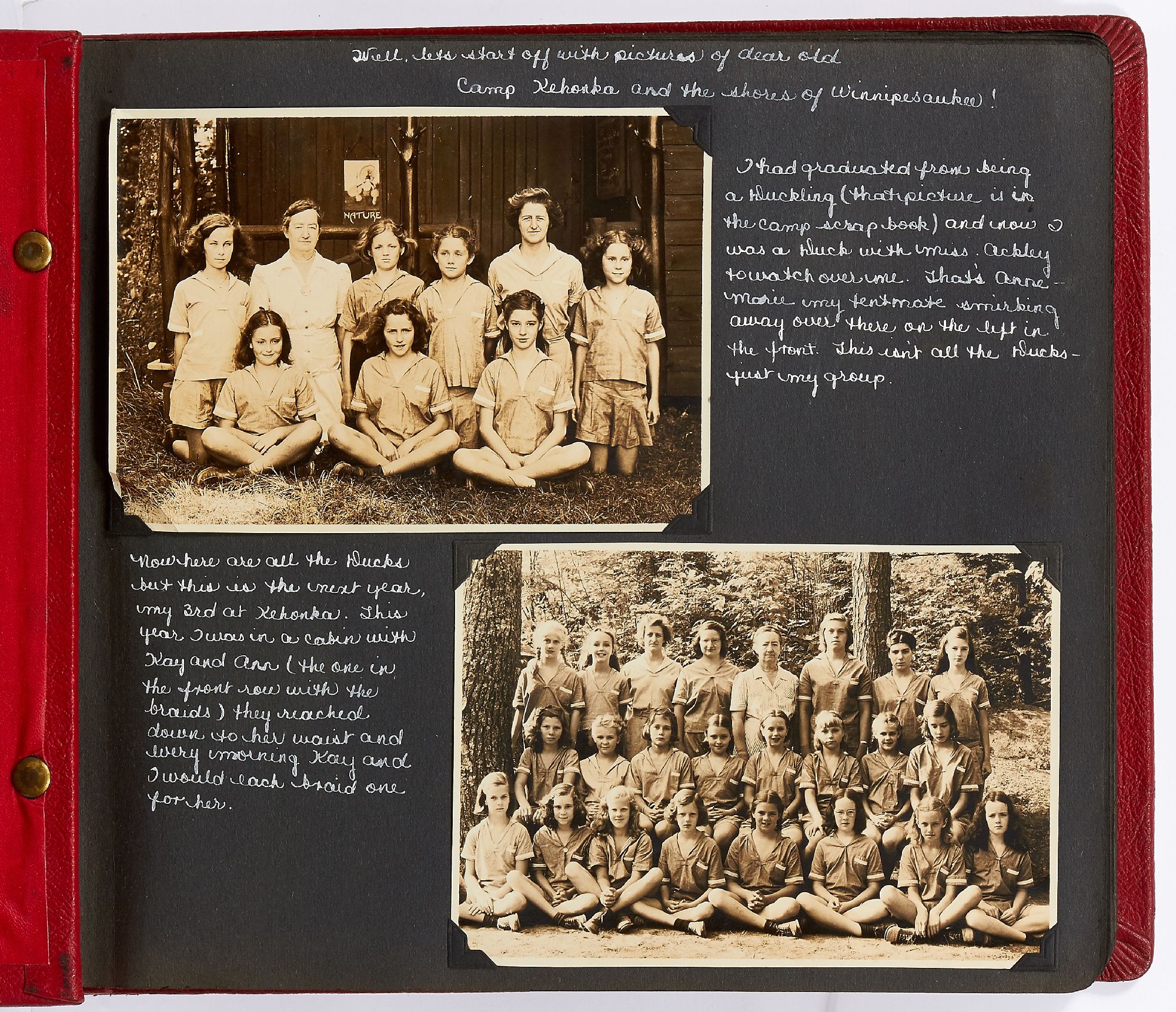 A photo album kept by a young woman who for multiple summers attended the Camp Kehonka, a private girl's camp in New Hampshire throughout the end of the 1940s. Many of the photos show professional group photos from each summer she spent at the camp. The photos are also heavily captioned and the album begins with “well, let’s start off with pictures of dear old Camp Kehonka and the shores of Winnipesaukee!” It’s followed by a group photo which reads, “I had graduated from being a Duckling (that picture is in the camp scrapbook) and now I was a Duck with Miss Ackley to watch over me. That’s Anne-Marie my tentmate smirking away over there on the left in the front. This isn’t all the Ducks – just my group.” She rose through the ranks of various waterfowl which also included the Goose Group, a group of older girls, in 1948. The group photo of the Goose Group reads, “this was the best year and the best group. Roomed with Ruthie (first in first row) and Pencie (third in last row). In the second month I was in a tent with Sally (sixth in second row), that is when we weren’t in Canada.”
