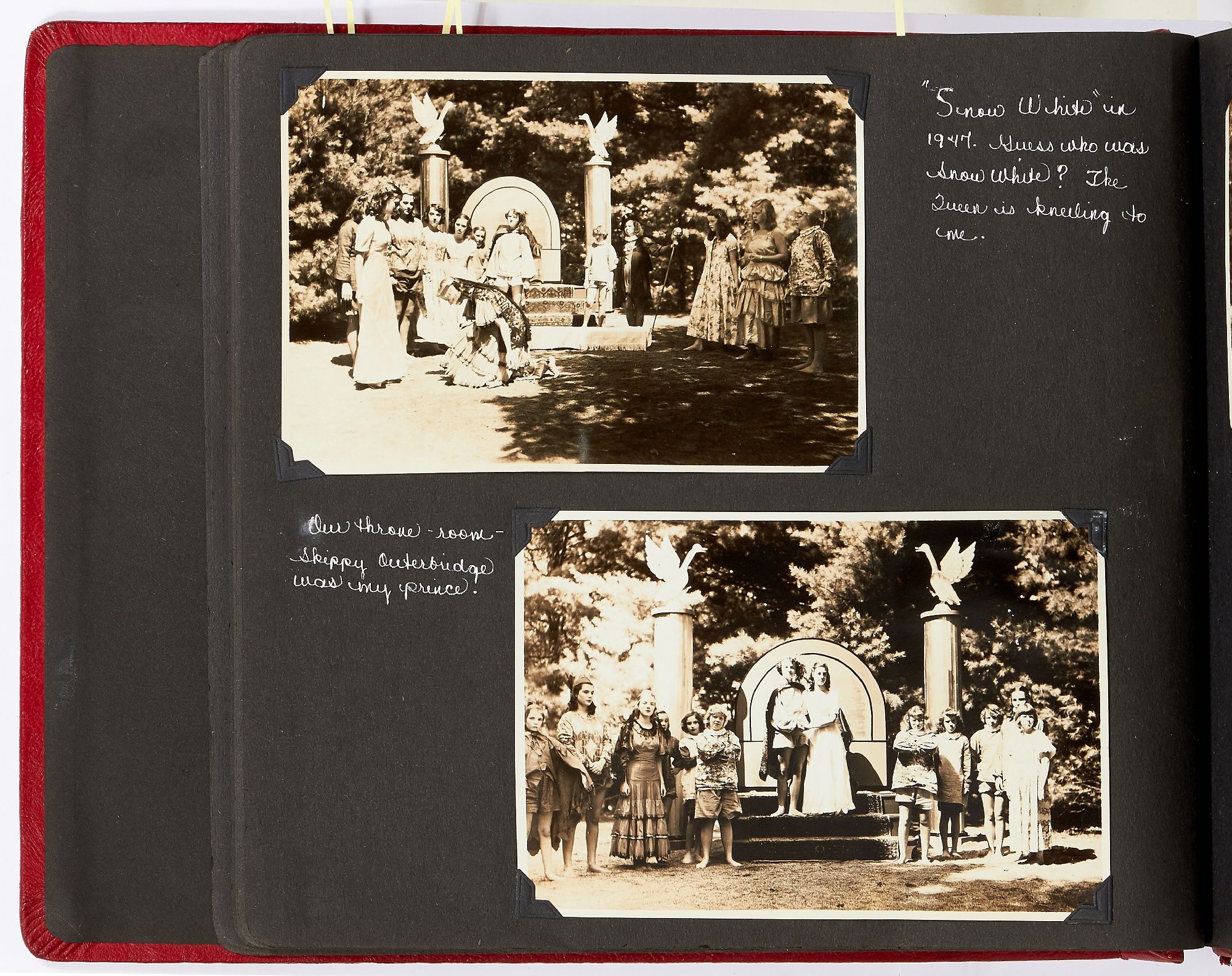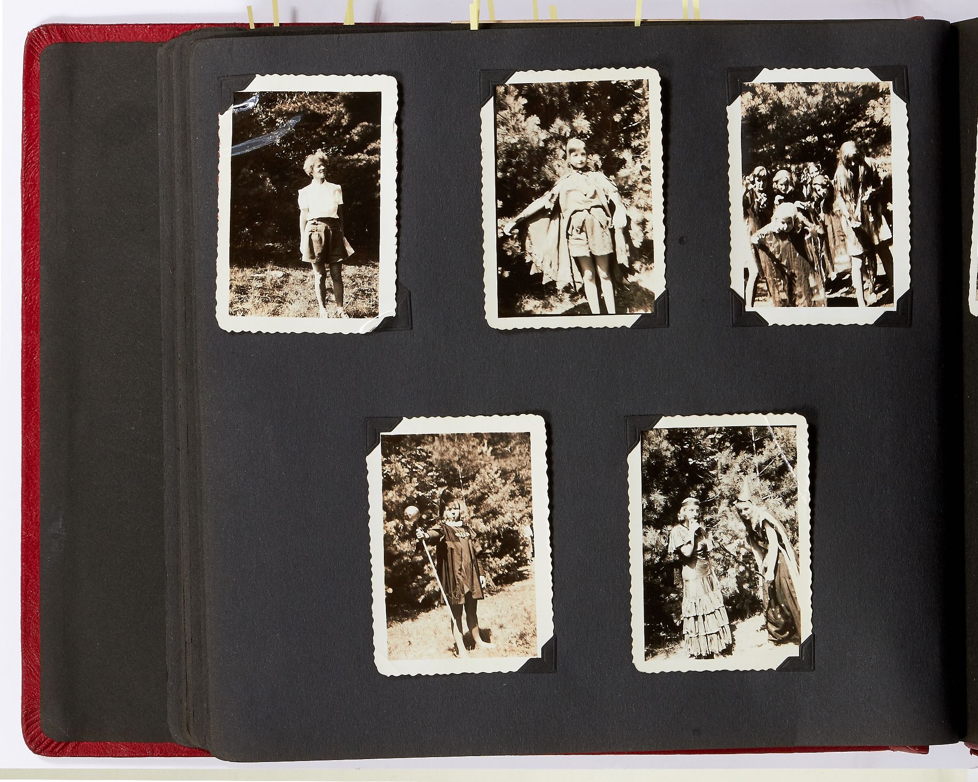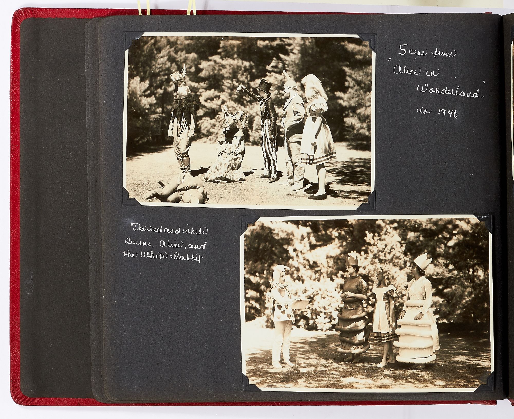 After the group photos the album continues with images of camp activities including raising the flag, boating, and Sunday service. There are also candids of the girls in their rooms, working in the kitchen, and in the dining hall. One photo shows the girls in a common room and reads, “around the fire in the Duck Lodge. Guess who belongs to the long hair? It won’t ever be that long again.” One section of photos show the girls performing in an Alice in Wonderland play which included photos of multiple Alices, the King and Queen of Hearts, and the White Rabbit. They also put on a play of Snow White and the Seven Dwarves in 1947 in which the compiler of the album played Snow White. The landscape of the camp is seen throughout the album with better than average amateur photography showing images of the girls on horseback, a beautiful sunset over the lake, and campers posed in their tents. The final pages show candids and portraits of the girls around camp, sunbathing, playing tennis, and at theater practice.